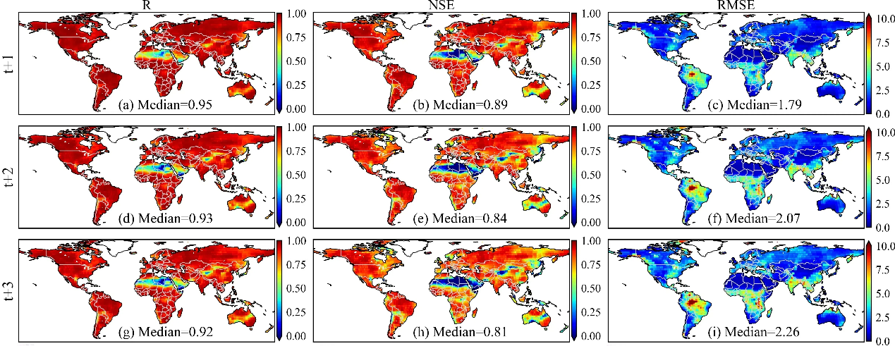 图 1BCNN模型对GRACE/FO卫星3个月数据滞后期(t+1, t+2, t+3)TWSA的预测精度:相关系数R(左),纳斯效率系数NSE(中),均方根误差RMSE(右; cm)