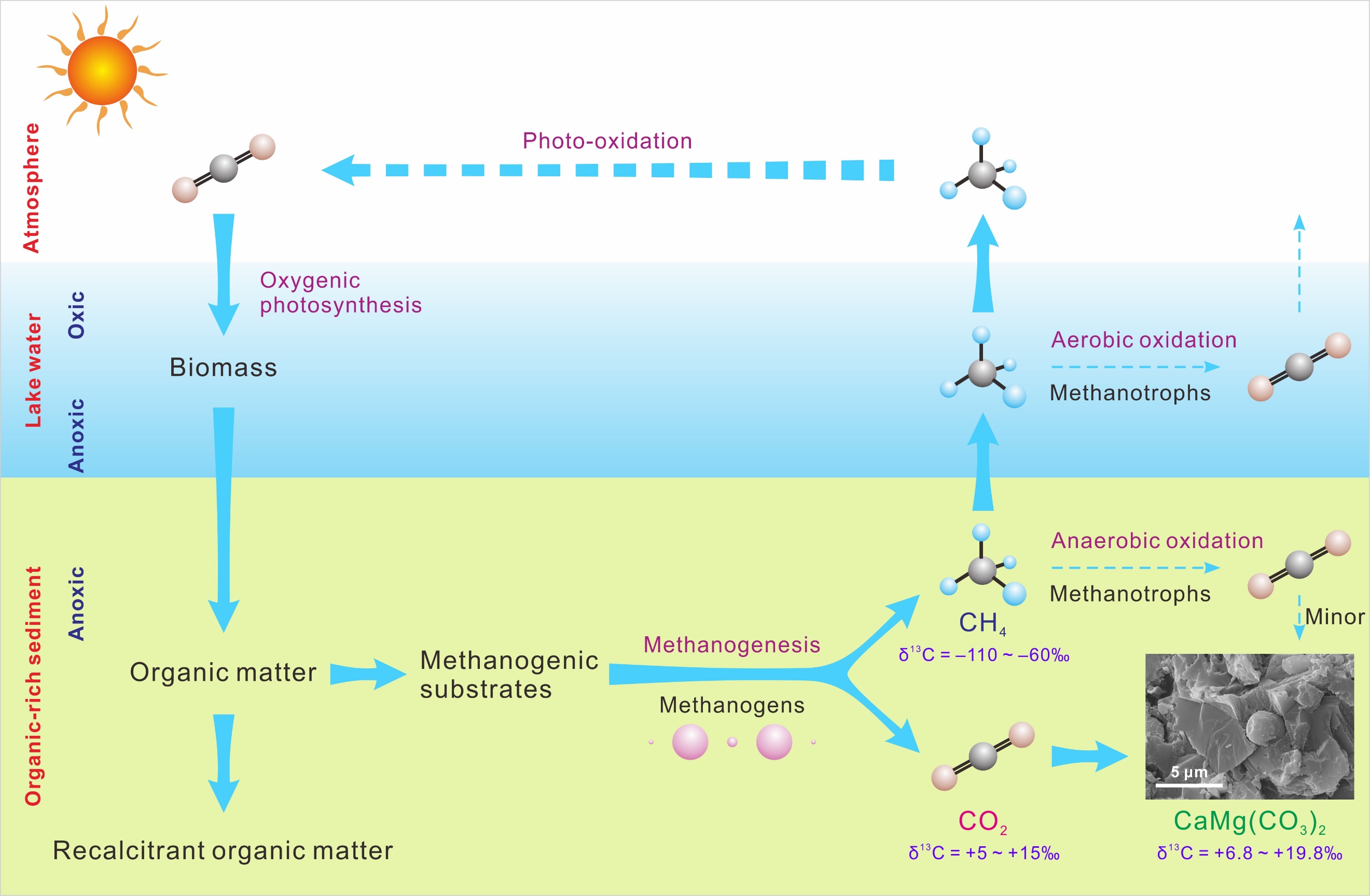 微生物产甲烷作用不仅是浅埋藏沉积中生物成因天然气的形成机制,而且是大气中温室气体甲烷的主要来源(约占当前全球甲烷排放总量的74%)。因此,产甲烷菌作用是生物气藏形成和全球碳循环的关键环节之一。但目前为止,地质时期微生物产甲烷的直接证据不多,对古湖泊中甲烷产生和排放过程也知之甚少。