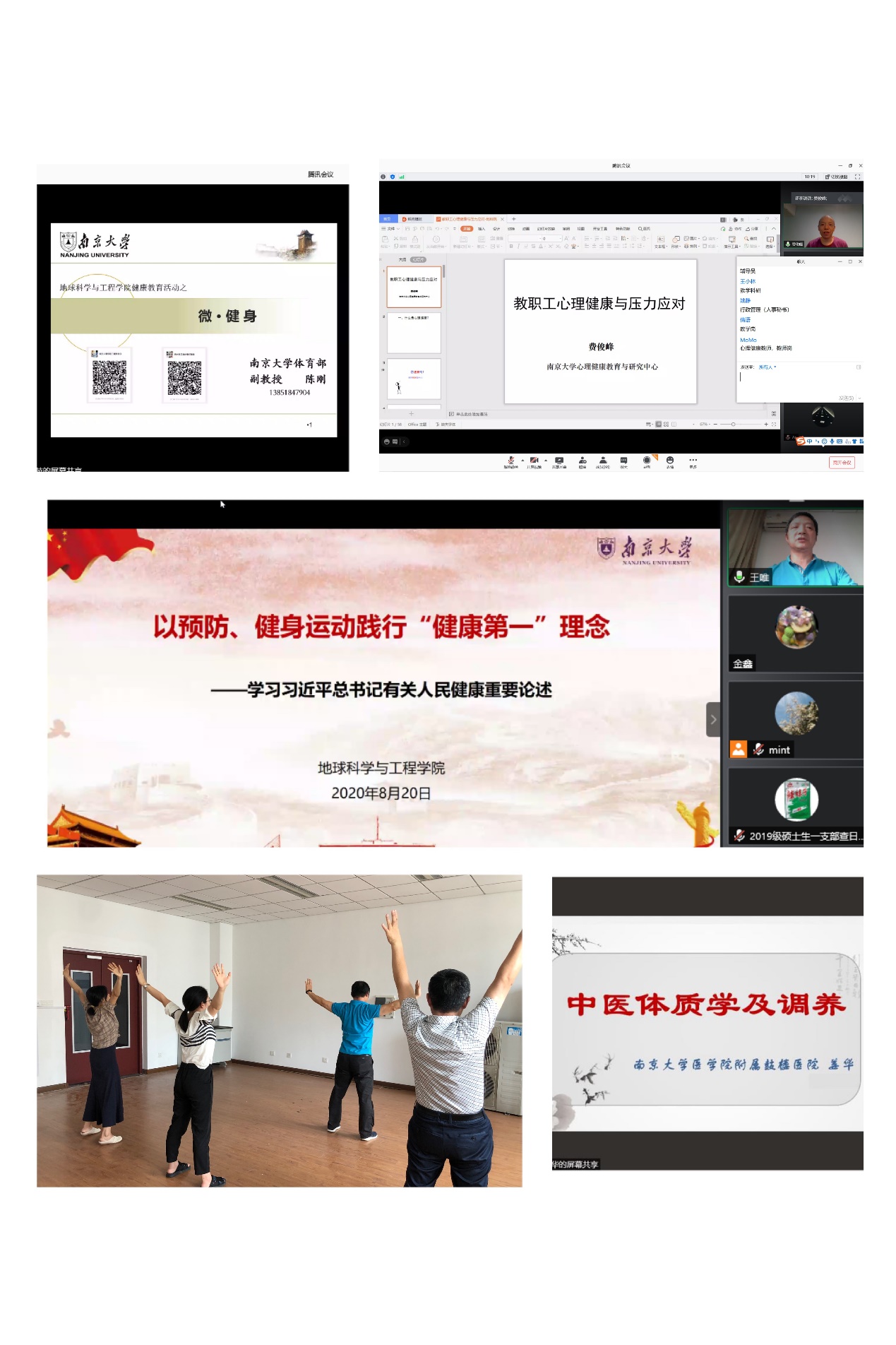 为践行习近平总书记“健康第一”的教育理念,关爱师生员工的身心健康,提高全院师生健康意识,学会科学健身方法,保持身心愉悦、积极向上的健康心态;为加强“双一流”建设,实现“第一个南大”奠定健康基础,304永利集团官网入口党建和业务培训中心、分工会共同举办地科院健康教育培训系列活动。本次活动于8月20日-28日期间开展,分别由院党委书记王唯讲授微党课并开设武术站桩和健身气功八段锦培训,邀请校体育部陈刚副主任作题为《“微”健身》、校心理中心费俊峰主任作题为《高校教职工心理健康和压力应对》、304永利集团官网入口医学院附属鼓楼医院中医内科姜华主任医师作题为《中医体质学及调养》的三场专题讲座,从运动健身、心理健康、身体调养等方面为学院师生打造一套全方位健康培训课程。