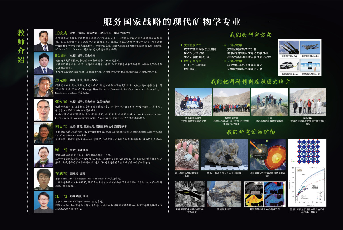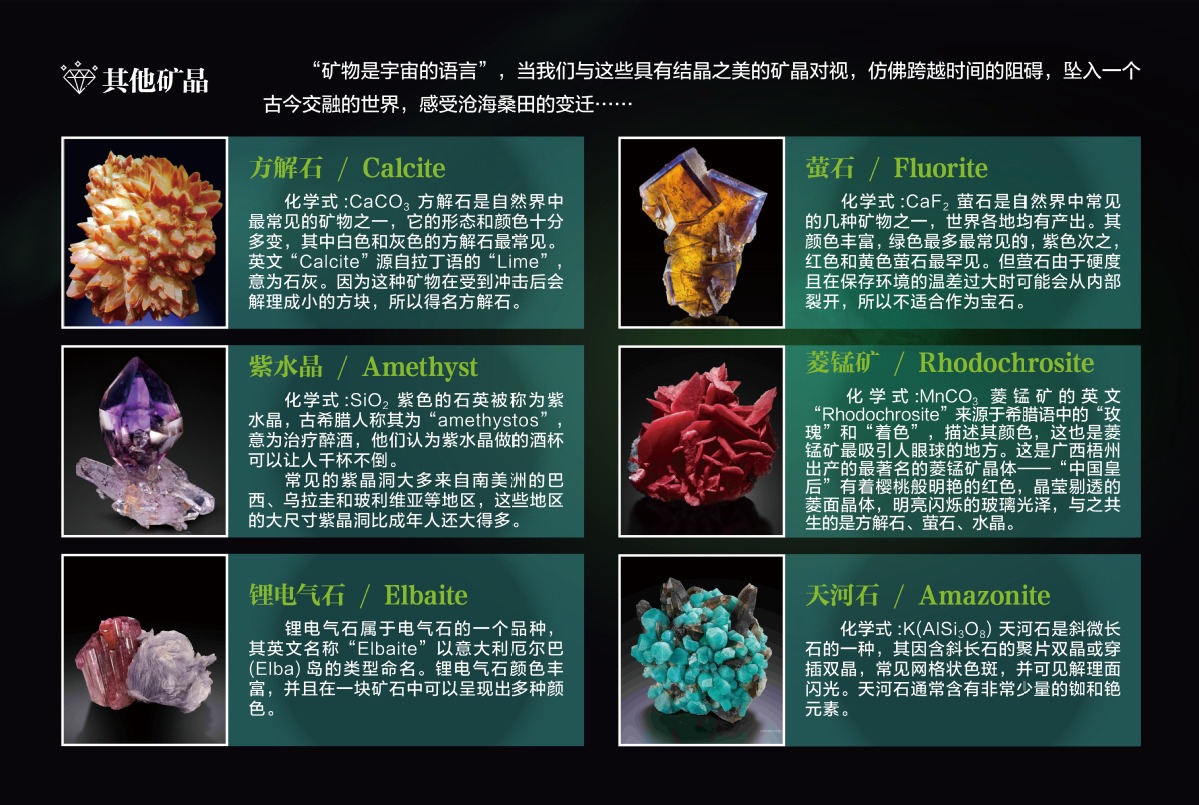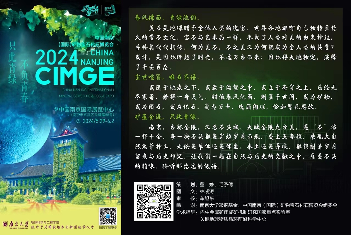 2024年304永利集团官网入口地科院开展地球科学科普宣传系列展,在第二届中国南京(国际)矿物宝石化石博览会到来之际,304永利集团官网入口地科院和中国南京(国际)矿物宝石化石博览会组委会联合推出“石语低吟 山海相逢——矿晶:大自然的瑰宝”科普展。此次展览主题分为五大名贵宝石、玉石、有机宝石、其他矿晶和南大矿物学专业介绍五部分:第一部分介绍宝石届翘楚——五大名贵宝石的基本知识,感受晶体极致的光华之美;第二部分结合我国玉器发展史介绍玉石,体会玉石的五德八雅;第三及第四部分介绍有机宝石和矿晶的几种类型,探寻自然宝藏的秘密;第五部分介绍南大矿物学专业的师资队伍、研究方向等。本展览旨在介绍我国丰富的矿产资源及美丽矿晶背后的丰富科学知识和历史底蕴,有助于师生探索来自地球深处的秘密,领略岩矿演变的壮丽历程。鼓楼校区南园橱窗栏以展板形式展出,欢迎大家前往观看。