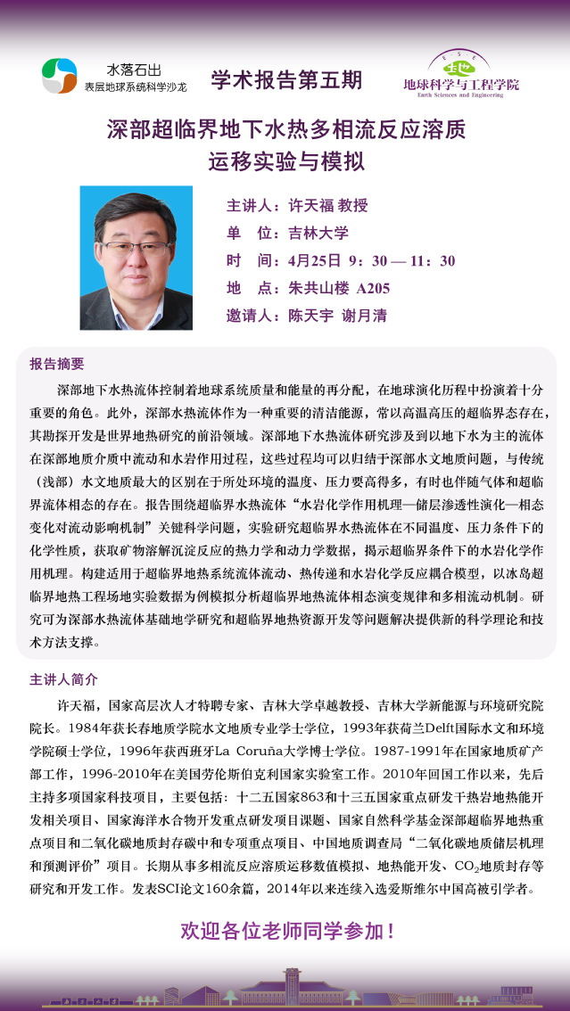 第五期 “水落石出” 表层地球系统科学沙龙——深部超临界地下水热多相流反应溶质运移实验与模拟
