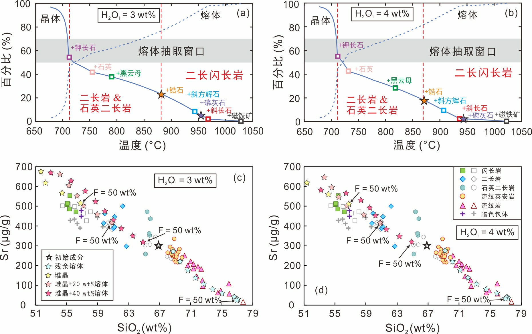 图1(a)和(b)Rhyolite-MELTS模拟的不同水含量条件下矿物的结晶顺序。(c)和(d)基于Rhyolite-MELTS模拟结果的质量平衡计算。