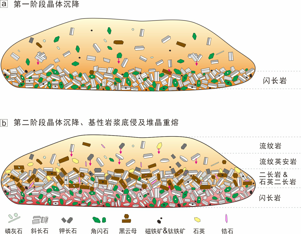 图2 桐庐岩浆房演化模式图。(a)第一阶段结晶沉降。(b)第二阶段晶体沉降、基性岩浆底侵和底部堆晶低程度熔融。