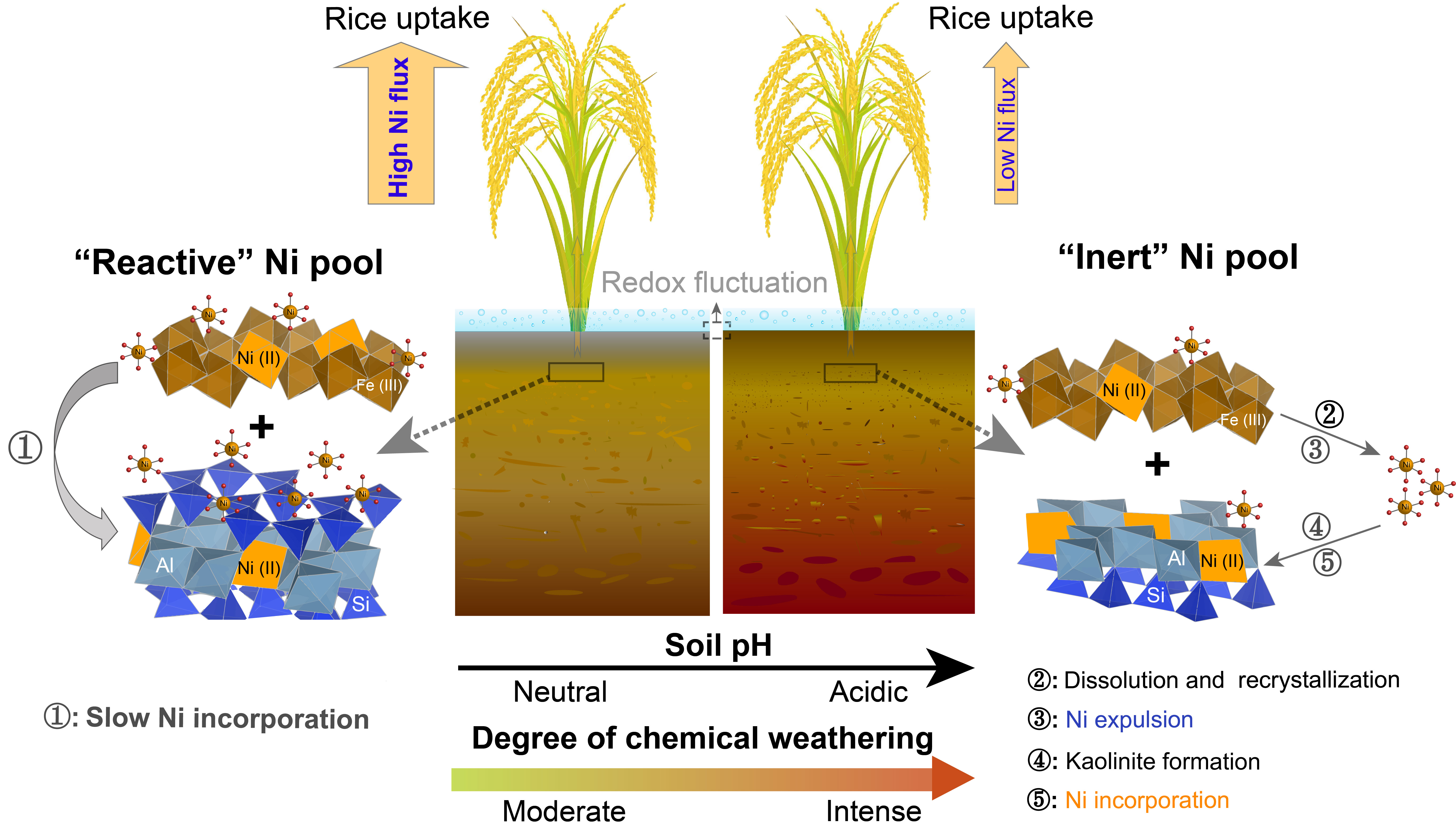 随着全球人口的持续增长,人类的粮食安全越来越依赖于土壤健康。全球范围内,农田土壤中高的镍(Ni)含量与玄武岩风化密切相关。水稻养活了全球一半以上的人口,但与其他粮食作物(如小麦和玉米)相比,水稻更容易累积Ni。玄武岩风化发育形成的稻田广泛分布于温带和热带地区,但目前对这些稻田系统中Ni的地球化学行为和影响因素知之甚少。元素的生物有效性在元素的表生地球化学循环中起着关键作用,目前土壤pH被认为是影响元素生物有效性最重要的因素。然而随着化学风化增强,土壤溶液中大量的Ni进入次生矿物可能使得pH对Ni生物有效性的控制作用失效。除pH外,氧化还原电位(Eh)可以通过影响铁氧化物的溶解-沉淀间接影响Ni的生物有效性。前人野外观测表明,铁氧化物中Ni的富集对化学风化强度的响应是非单调的,这暗示了Eh的重要作用。然而,不同气候条件下稻田系统中Ni的迁移转化和生物有效性对化学风化的响应机制仍不清楚。