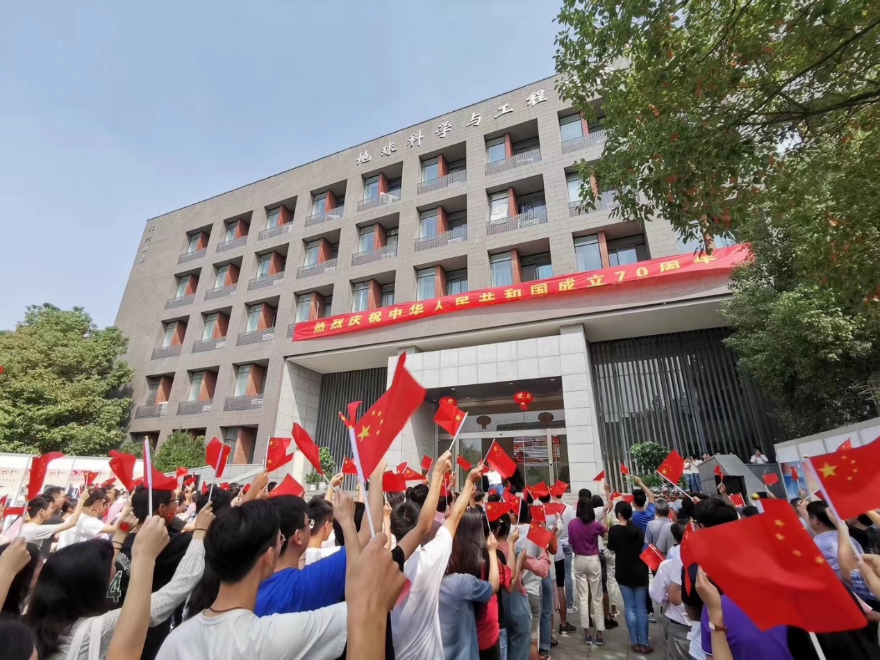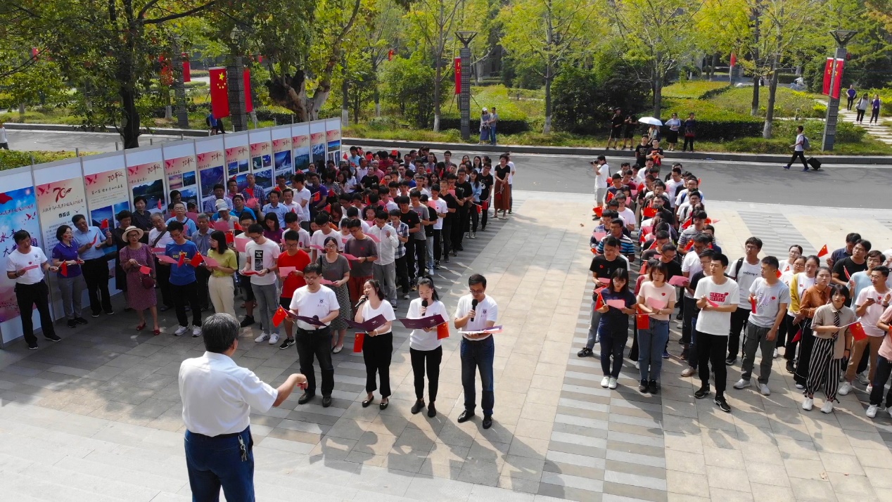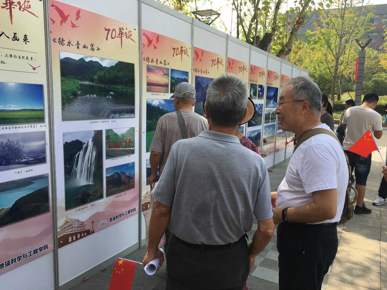 值此新中国成立70周年之际,9月30日下午1点,地科院师生在朱共山大楼前,举办了隆重的庆祝中华人民共和国成立70周年系列活动——《歌唱祖国》和“绿水青山 、大美中国”主题摄影展活动,为祖国七十周年献上诚挚的祝福。我们以诗言志,我们以歌传情,我们以影展印证祖国的绿水青山美。一张张激动的笑脸举旗高呼“我爱祖国、我爱地科”!一张张视觉图片激发人们的文化认同和情感共鸣,为祖国生日献礼!