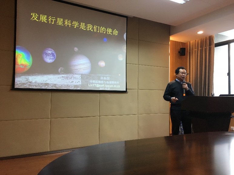 揭牌仪式上,张爱铖教授向参加揭牌仪式的嘉宾和师生汇报了我校发展行星科学的紧迫性、发展历史、发展现状以及未来十年规划。