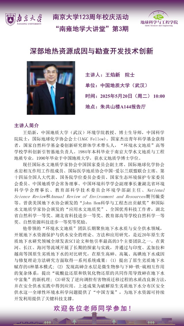 “南雍地学大讲堂第三期”——深部地热资源成因与勘查开发技术创新