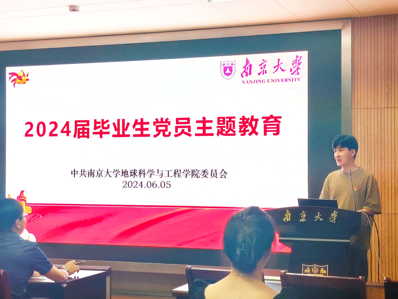 接下来,2021级毕业生党员代表、硕士生第一党支部书记陈雨萌作为一名即将毕业的南大地科党员回顾自己的学习生涯,她感谢党组织的关心和老师的悉心指导,对各位毕业生党员同志提出了两点希望进行共勉:一是要牢记自己的责任,为国家的发展贡献力量;二是要珍惜青春时光,勇敢面对未来的挑战,人生充满了艰难困苦,但前辈的经验和榜样的力量是克服这些困难的重要资源。最后她表达了对学校深深的感激之情,并祝愿老师们身体健康,工作顺利。同时,她也表示自己将致力于国家的现代化建设和民族的伟大复兴,展现青年学子的责任感和使命感。