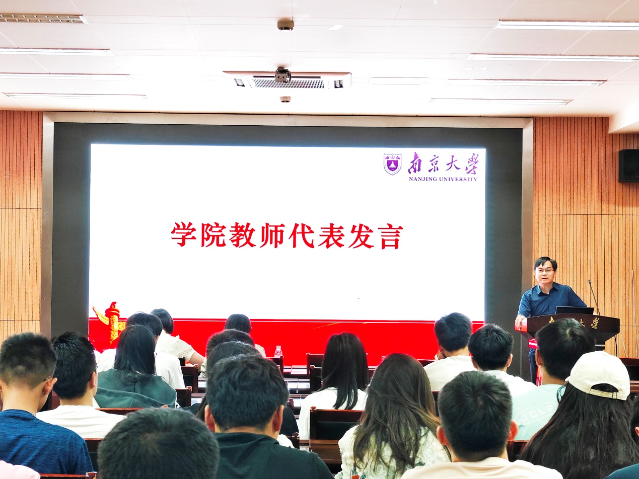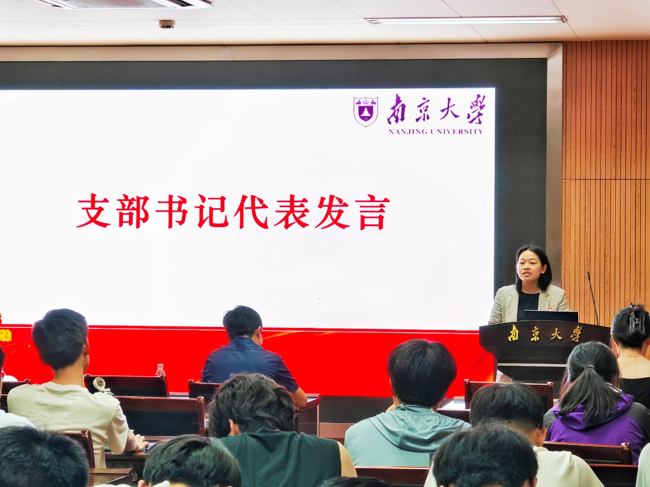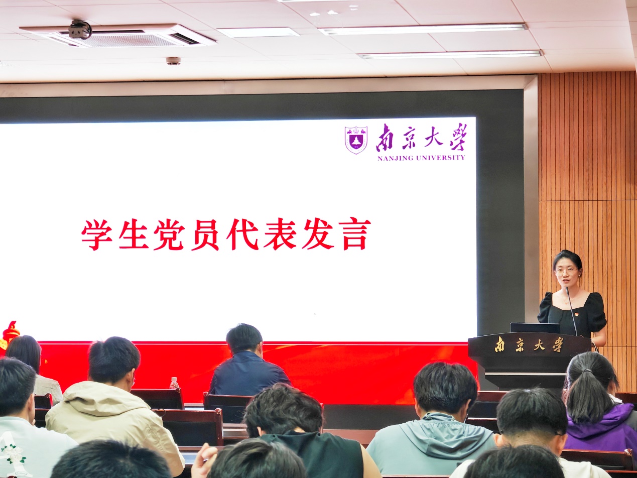 接下来,院长助理、留学归国青年学者、教师党员陈天宇老师讲述了自己作为有着近二十年党龄的老党员关于人生经验、专业发展及党员责任的心得体会,他强调党员应认识到自身的先锋模范作用,并随时准备着发挥带头作用。他鼓励在校生珍惜时间,努力学习专业知识,并保持对未来的积极态度。结合自己的职业生涯发展,他鼓励学生们保持开放心态,勇于合作,持续学习新技术,以提高自身竞争力。同时他关注到当前的社会经济形势和就业市场情况,鼓励毕业生保持自信,勇敢面对挑战,坚持自己的理想和目标。最后,他重申了党员的责任感和使命感,呼吁大家在任何情况下都不要忘记党员身份,用实际行动回报祖国、服务人民,实现“今天我以南大为荣,明天南大以我为荣”的目标。