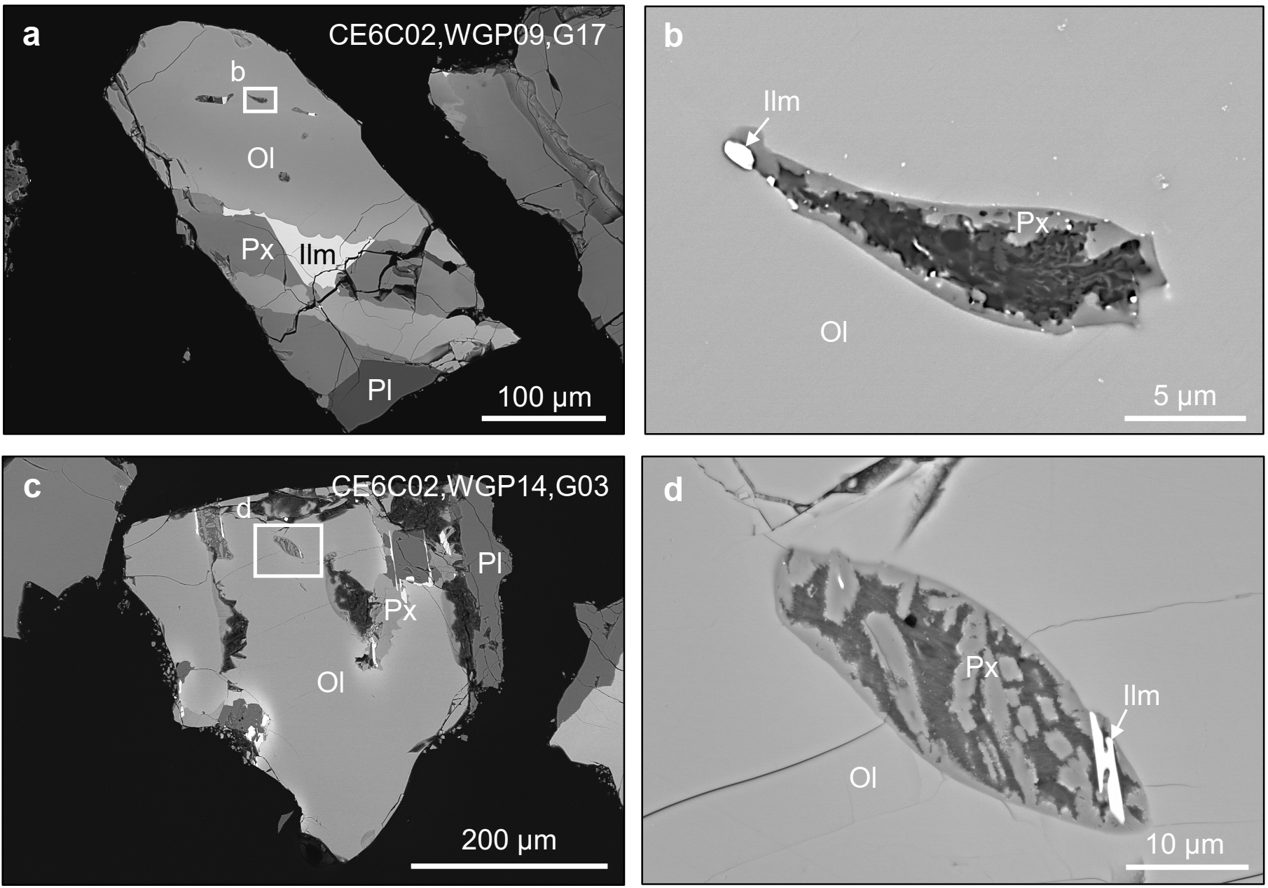 图2.嫦娥六号玄武岩中熔体包裹体的岩相特征。嫦娥六号玄武岩中的橄榄石极其稀少,仅发现两颗富含橄榄石的玄武岩,并发现了几十微米大的数颗熔体包裹体。Ol:橄榄石;Px:辉石;Ilm:钛铁矿;Pl:斜长石。图引自He等(2025)。