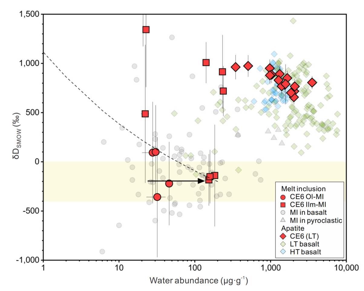 图3.嫦娥六号玄武岩样品熔体包裹体和磷灰石的水含量及氢同位素组成。橄榄石中熔体包裹体具有最低的水含量和最轻的氢同位素组成。钛铁矿中的熔体包裹体水含量和氢同位素组成变化范围较大。磷灰石具有结构水故而具有相对高的水含量,对应有最重的氢同位素组成。MI:熔体包裹体;LT:低钛类型;HT:高钛类型。图引自He等 (2025)。