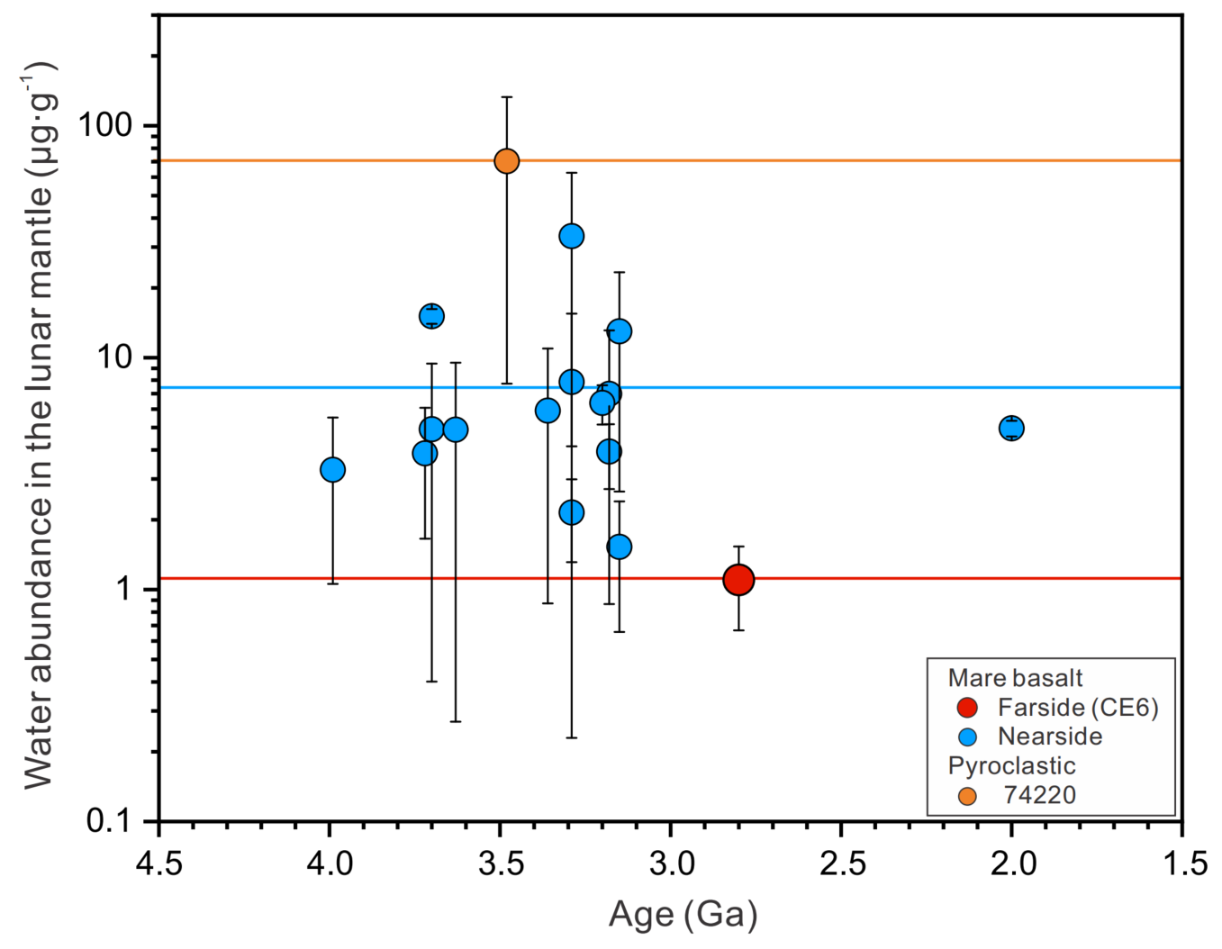 图5.月球内部的水含量与时间的关系。嫦娥六号玄武岩样品揭露了迄今为止最干的月幔。图引自He等(2025)。