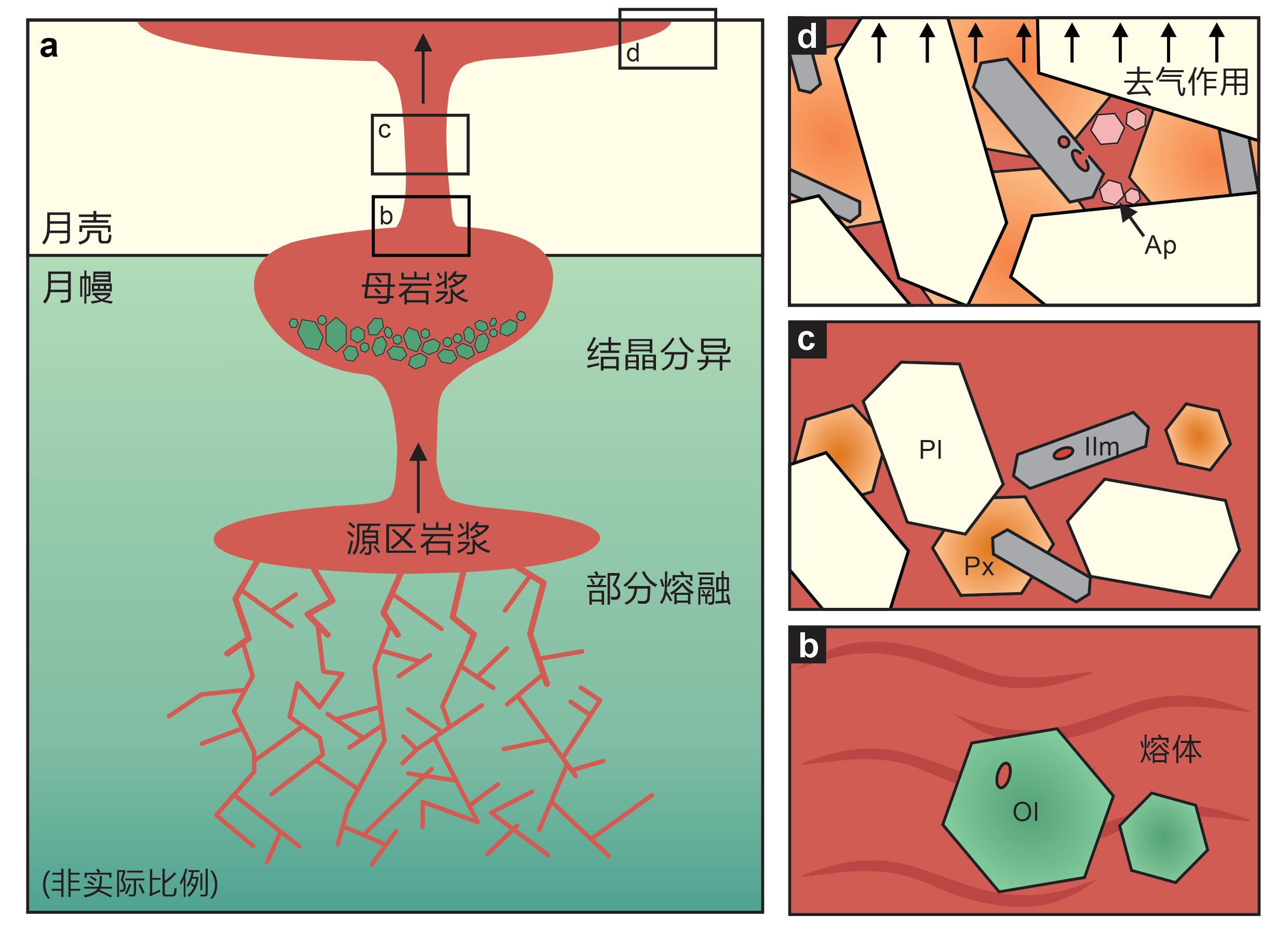 图4嫦娥六号玄武岩浆演化示意图.(a)岩浆演化全貌图,通过月幔部分熔融形成的玄武质岩浆在经历结晶分异演化后上涌至月表。(b)、(c)和(d)分别为该过程的局部图。(b)橄榄石在岩浆中最早结晶,其中的熔体包裹体可以代表早期岩浆中的挥发分特点。(c)钛铁矿在岩浆中期结晶,其中的熔体包裹体可以代表中期岩浆中的挥发分特点。(d)磷灰石结晶于岩浆末期,代表了末期岩浆的挥发分特点。图引自He等(2025)。