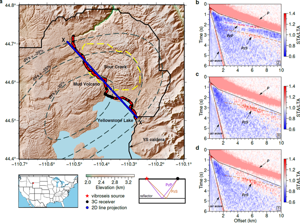 美国黄石国家公园在沸腾冒泡的间隙泉和泥浆之下,隐藏着北美最大且仍处于活跃状态的“超级火山”,在过去两百万年中,它曾数次以巨大能量爆发,对整个北美、甚至全球产生了极大影响。火山系统的稳定性,在很大程度上受控于上部岩浆储库的深度,以及挥发性气体的析出过程。尽管已有大量物理和化学证据表明,黄石火山口下方存在上地壳岩浆储库,但由于缺乏高度局部化的观测,岩浆储库顶部的深度及其物性特征是一个长期未得以明确的科学问题。过去一段时间,利用透射体波或面波进行地震成像所生成的平滑波速图,虽然可大致反映岩浆储库的几何形态和平均内部性质,但因其边界模糊、分辨率不足,导致了对储库顶部的深度估算范围在约3–8公里之间。如此大的不确定范围,必然导致在不同深度下,挥发性气体的析出量以及相应的火山稳定性条件存在显著差异。