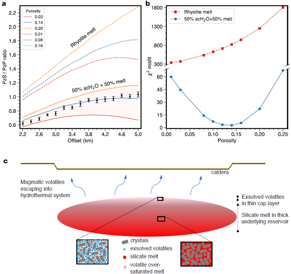 图3:(a-b) 不同总孔隙率和流体类型条件下,PzS/PzP振幅比随偏移距变化的拟合结果。最佳拟合结果对应总孔隙率为14%,且孔隙中由等体积分数的超临界水与流纹岩熔体组成的充分混合流体。若孔隙中充满无气泡的流纹岩熔体,拟合效果显著变差。(c)岩浆库构造示意图。该岩浆库主体由晶体组成,岩浆只占据晶体间的孔隙空间。岩浆库顶部的薄层中,气泡在上升过程中暂时积聚其中,并停留在晶体与部分熔体之间的孔隙中形成富含气泡的临界态。图引自Duan等(2025)。