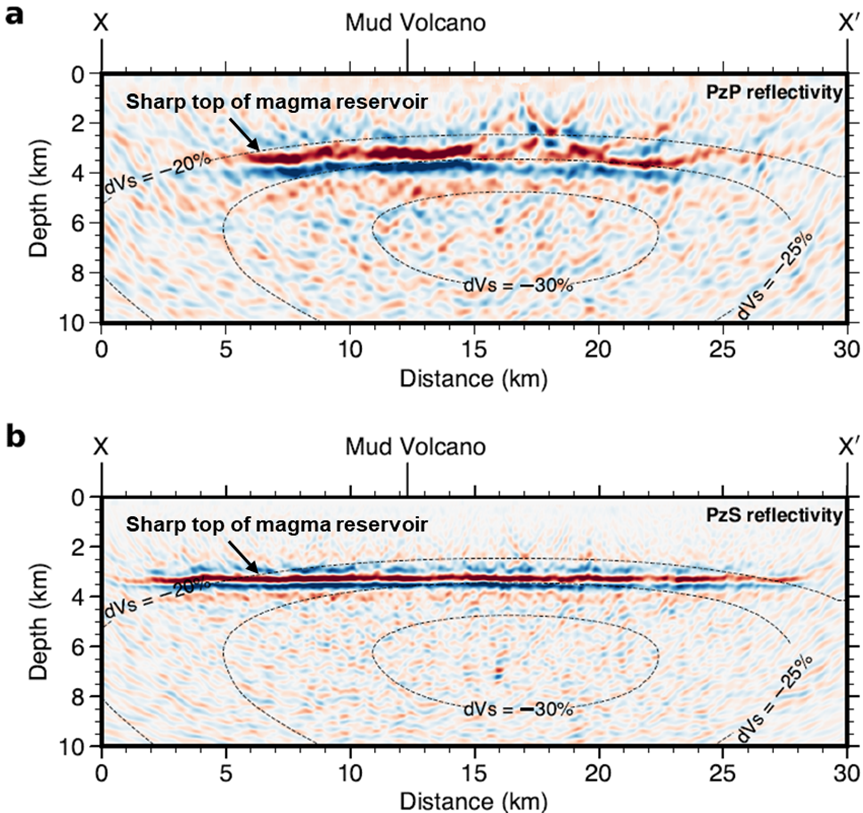 图2:PzP和PzS反射图像显示在大约3.8公里深处存在一个明显的岩浆储库顶部界面。虚线表示剪切波速度变化(dVS)等值线。图引自Duan等(2025)。
