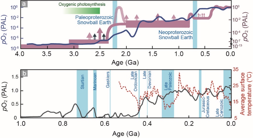 图3. 地质历史时期大气增氧事件和气候变冷(冰期)事件的发生时代