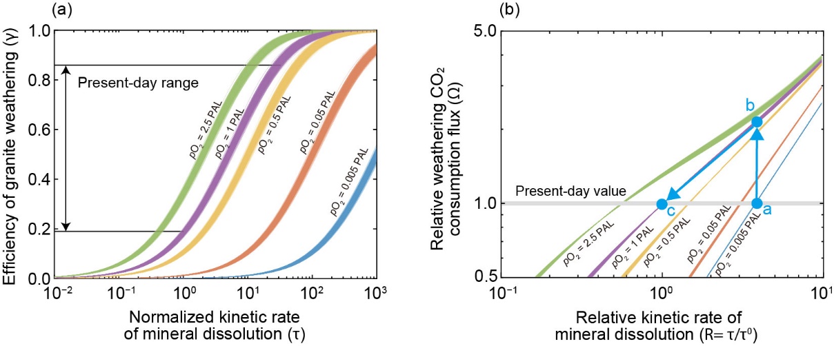 图2. 花岗岩风化效率及其二氧化碳消耗量与硅酸盐矿物溶解速率和大气氧浓度的相关关系