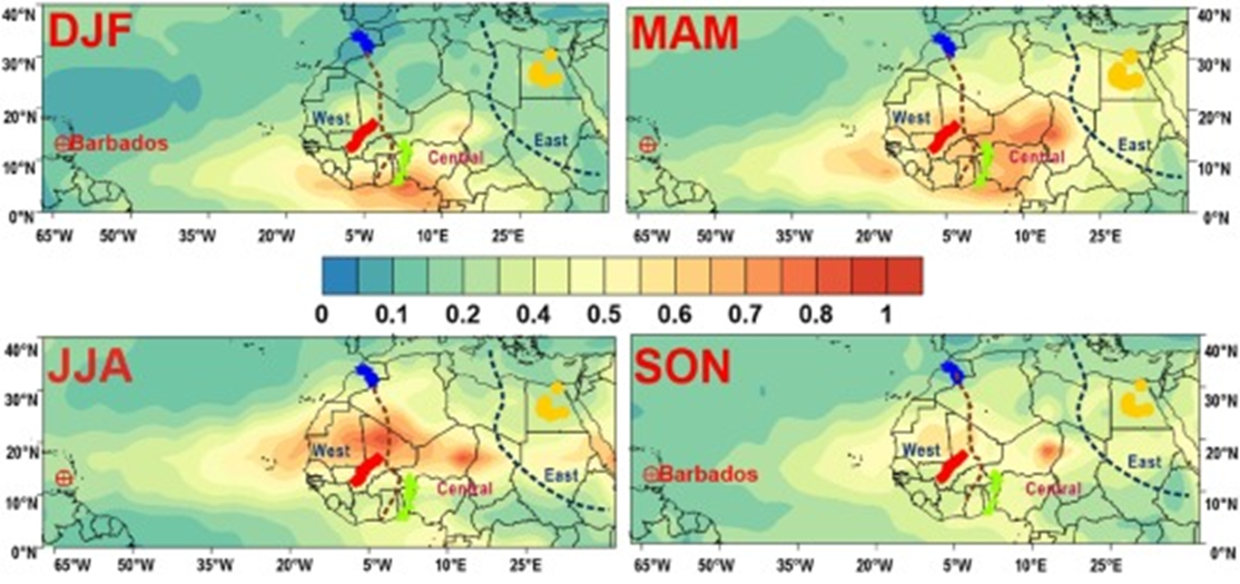 图1.季节变化的光学气溶胶厚度(AOD)与北非尘源同位素分区