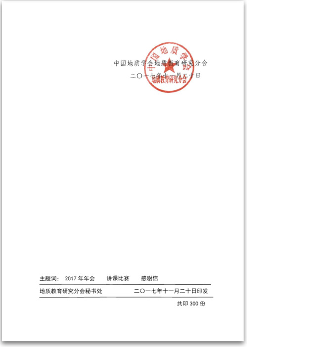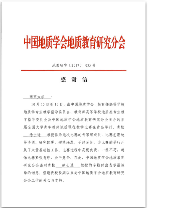 中国地质学会地质教育研究分会致徐士进教授的感谢信