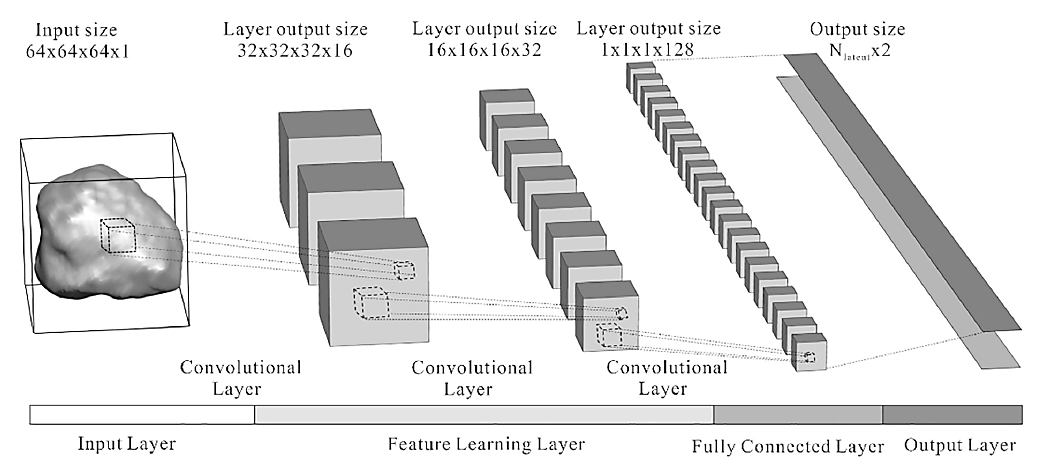 基于以上原理,永利集团官网张巍副教授课题组以广泛分布于我国长江中下游的南京粉砂为例,采用显微CT扫描少量南京粉砂样品,通过分水岭算法分割出单个砂粒,并使用一个四维张量(即四维矩阵,深度学习与力学中对张量的定义不同)存储单个数字砂粒,其中前三维用于存储颗粒的三维灰度值信息,第四维用于存储图像的通道数信息。如图1所示,将表征数字砂粒的四维张量输入卷积神经网络,最终输出一个包含砂粒形态隐式分布特征的二维张量。使用砂粒集合所有这些二维张量即可构建训练数据集。