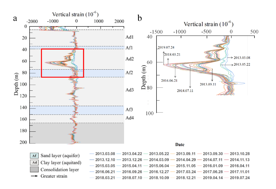 1a) 2013年至2019200m钻孔的光纤监测应变(Ad为隔水层)(b) 在钻孔40m88m之间的应变变化曲线。