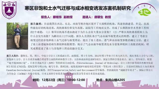 2021-12-22 中南大学滕继东副教授报告:寒区非饱和土水气迁移与成冰相变诱发冻害机制研