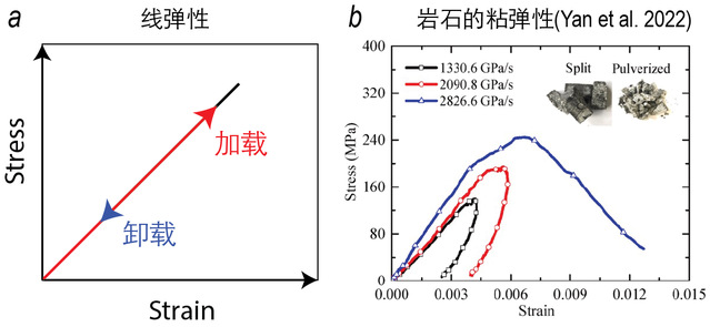 1左:理想线弹性的应力应变关系。右:不同加载速率下岩石的应力应变关系,具有粘弹性特征