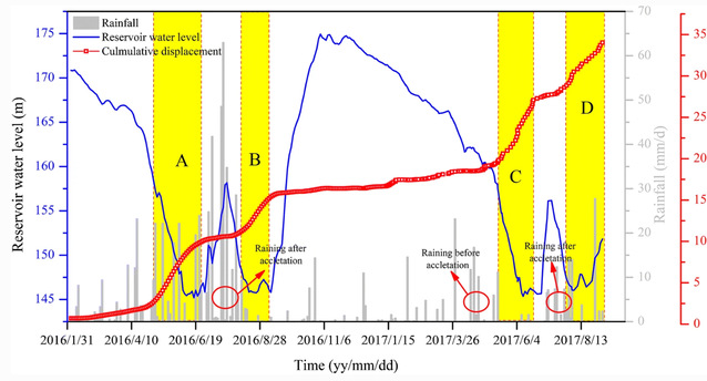 The accuracy of landslide displacement prediction can effectively prevent casualties and economic losses. To achieve accurate prediction of the Majiagou landslide displacement in the Three Gorges Reservoir (TGR), China, a hybrid machine learning prediction model considering the deformation hysteresis effect is proposed. The real-time deep displacement measurements were captured by using in-place inclinometers with Fiber Bragg grating (FBG) sensors. The time series method was adopted to divide the total displacement into a trend term and periodic term. Trend displacement was determined by the geological condition and predicted by the fitting method. Periodic displacement was controlled by external factors such as rainfall and fluctuation of reservoir water level. Before making the prediction, the grey correlation analysis was adopted to confirm that the fluctuation of the reservoir water level was the main influence factor. In view of the deficiency that current prediction methods could not quantitatively determine the lag time of landslide deformation and thus select the influencing factors empirically, the dynamic analysis of the correlation between periodic influence factors and periodic displacement was carried out in this paper, and the deformation lag time was identified to be 18 days by using set pair analysis (SPA) method. Finally, the optimal influence factors were selected and the prediction model of Majiagou landslide based on support vector machine optimized by particle swarm optimization (SPA-PSO-SVM) was established. Results showed that the root mean square error (RMSE) and the mean absolute percentage error (MAPE) of the proposed SPA-PSO-SVM prediction model are 0.28 and 12.8, respectively. Compared with the PSO-SVM model, the prediction accuracy of the proposed model had been improved significantly. The reliability and effectiveness of the SPA-PSO-SVM prediction model is verified and it has apparent advantages while predicting landslide displacement with deformation hysteresis effect involved.