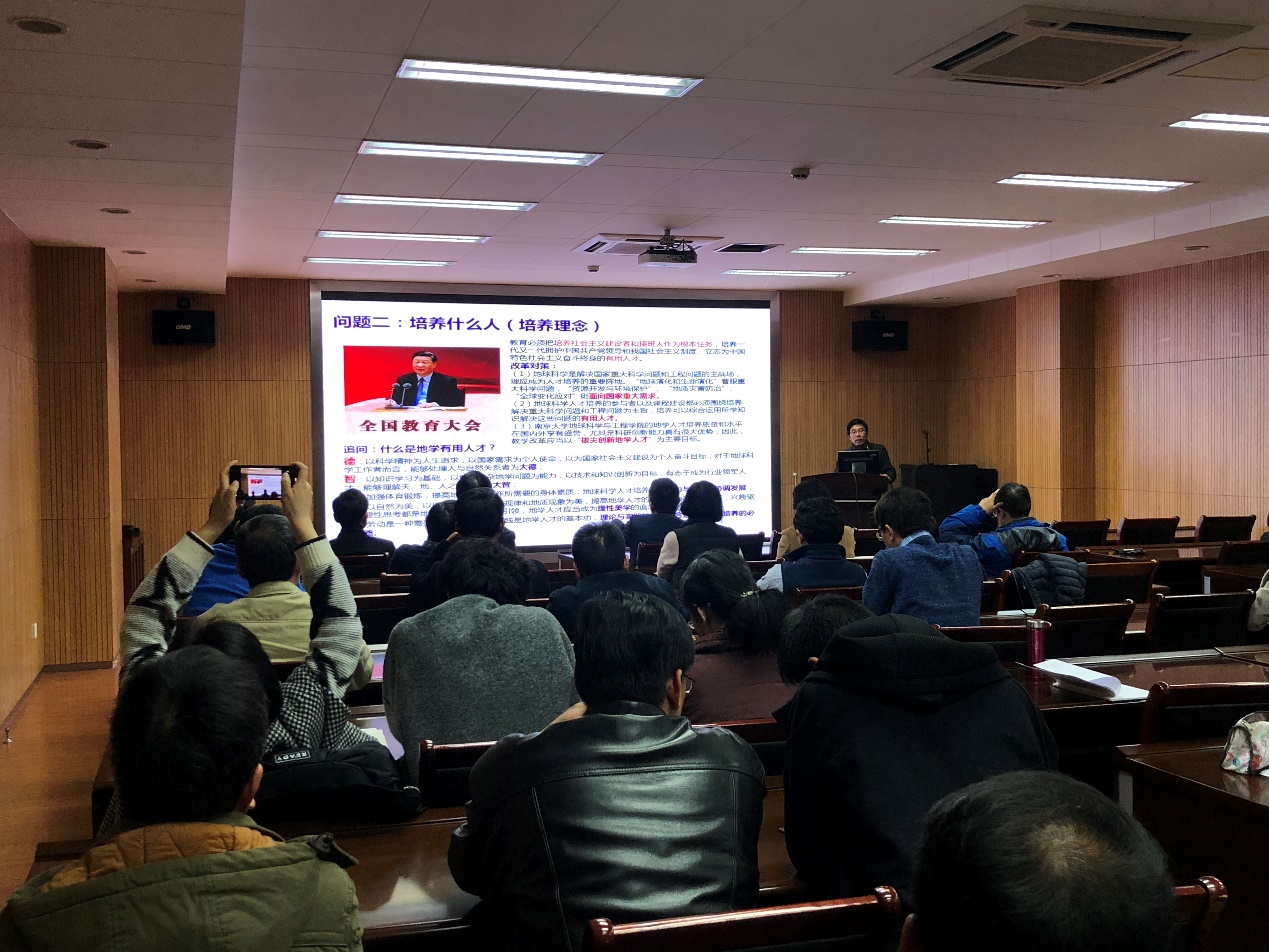 其次由分管本科教学的王宝军副院长做了题为“学习全国教育大会精神、深化本科教学改革”的报告,从“为什么要进行本科教学改革,如何进行人才培养改革以及改革顺利进行的保障措施”等三方面做了相关阐述,详细解释了改革中的核心问题——“为谁培养人、培养什么人、怎样培养人”。首先是“为谁培养人”:学院坚持全方位育人的思路,从地球科学的特色、中国特色、学院特色出发,努力培养合格公民,中国特色社会主义的建设者和接班人,培养重大国家需求和科学问题的求解者;其次是“培养什么人”:此次教学改革的落脚点是从德智体美劳五个方面培养具有健全人格的地球系统科学后备军人才;第三是“怎样培养人”,学院将从加强师德师风建设、坚持立德树人出发,把教师队伍建设作为工作的基础,从提升科教融合和教师教学能力、健全地球系统科学理论体系,简化知识总量等方面深化改革,超前布局,培养本科人才的国际视野和战略眼光。王院长最后要求各党支部结合所在学科特色,集中讨论如何在课堂教学中体现“思政元素”,理清本学科的人才培养理念,并围绕培养理念如何开展课程体系建设和课程改革。