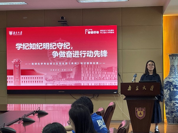 为深入学习贯彻习近平新时代中国特色社会主义思想和党的二十大精神,引导全体党员学纪、知纪、明纪、守纪,6月13日中午,地科院地化专业博士生党支部在朱共山楼A205会议室举行党纪学习教育主题党日活动,开展《中国共产党纪律处分条例》(以下简称《条例》)知识竞答比赛。会议由党支部书记严子妮同志主持,304永利集团官网入口党委常委、副校长,学院联系支部党委委员陆现彩老师出席会议。