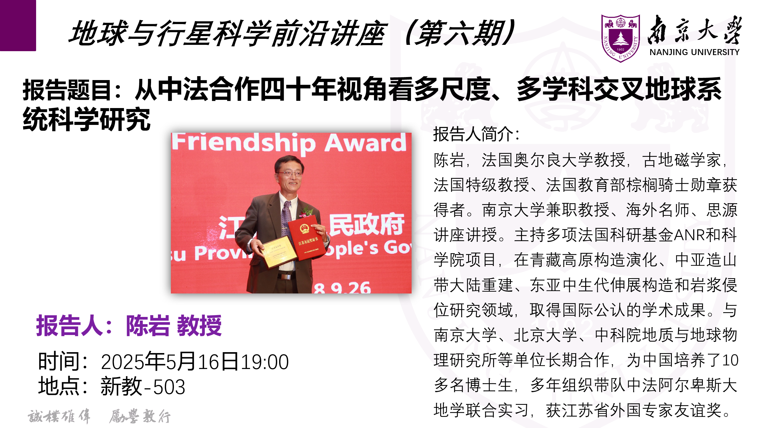 学院邀请了国际著名学者、法国奥尔良大学陈岩教授带来题为《从中法合作四十年视角看多尺度、多学科交叉地球系统科学研究》的精彩报告,为师生呈现了一场学术盛宴。学术讲座于5月16日在鼓楼校区新教学楼503教室举行,会议由王博副院长主持。