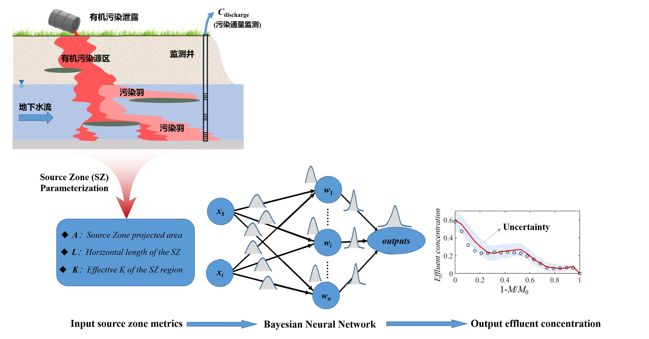 近日,永利集团官网吴吉春教授与施小清教授研究团队提出了一种基于可解释性神经网络研究地下水有机污染源-羽质量传输机制与污染通量预测的新方法。针对“有机污染源结构-污染羽”之间强非线性难表征的问题,研究团队构建了贝叶斯神经网络框架,首次从数据驱动的角度学习“有机污染源-羽”之间的复杂关系,并通过机器学习反向解译技术“期望梯度法”(Expected Gradients)剖析了有机污染源多阶段非线性溶出的物理成因及主控因素,发现污染源衰减初期的污染通量峰值主要受控于低饱和污染源的垂向展布,而衰减后期的污染通量拖尾值主要受高饱和污染源的横向长度与渗透性的综合控制。基于上述理论发现,研发了基于深度学习的有机污染源溶解升尺度预测模型,仅凭少量源区结构参数即可精准模拟多阶段非线性溶解过程,可为有机污染场地管控及风险评估提供有力的技术支撑。