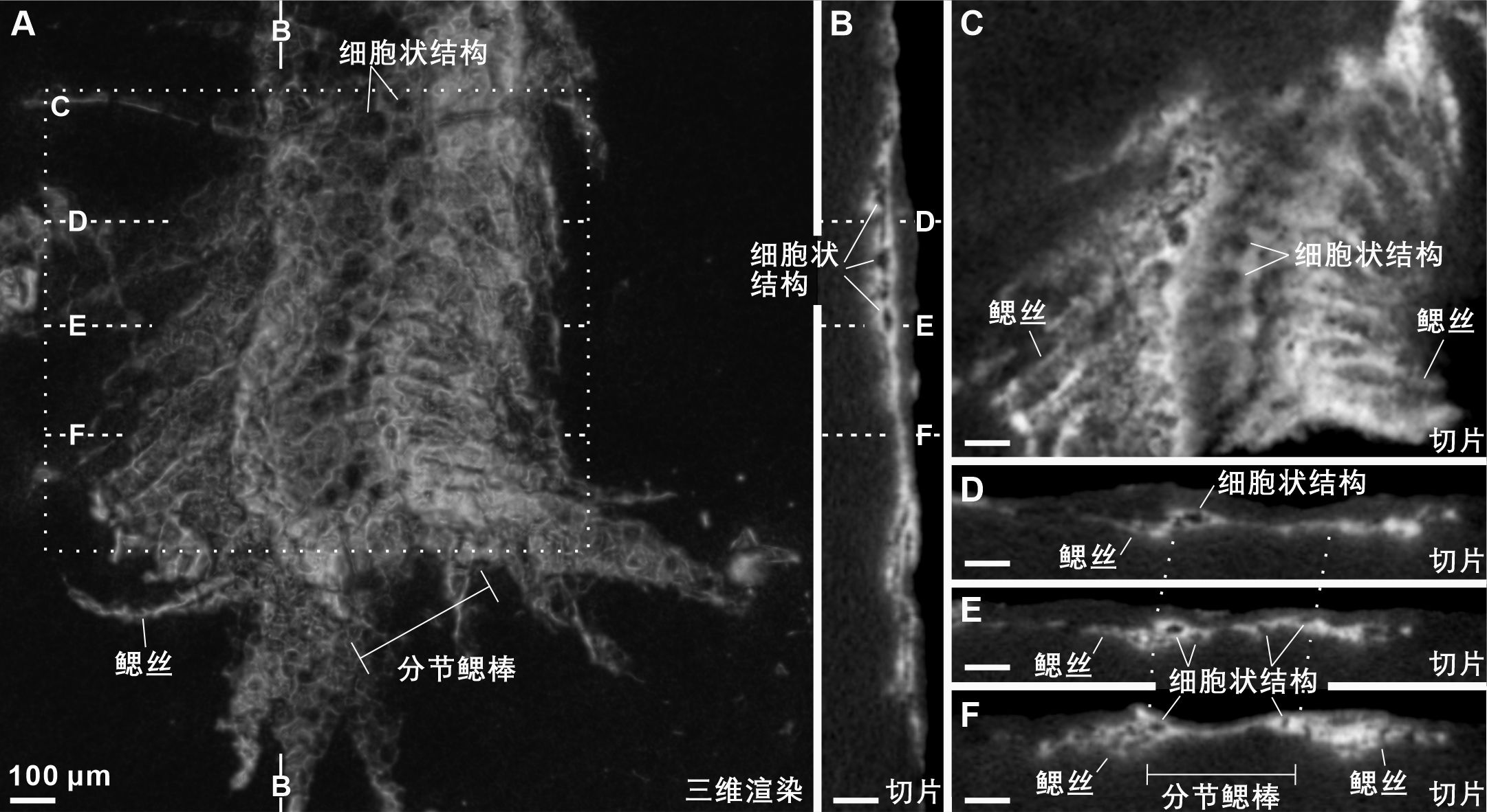 He等认为鳃棒是中空的管状结构,鳃棒的细胞状结构是中空的鳃丝根部形态(图1A)。但是,He等评述文章中展示的化石照片(图1B)显示鳃棒并非中空,含有紧密堆叠的细胞状结构。这些细胞状结构与鳃丝并没有一一对应(图1C)。原作者团队的显微CT扫描数据从多个角度揭示鳃棒不是中空的,而是由多排2–3个细胞状结构组成。这些细胞状结构呈密闭的空心球状,与鳃棒两侧的鳃丝并不相通,排除了是鳃丝根部形态的可能(图2)。