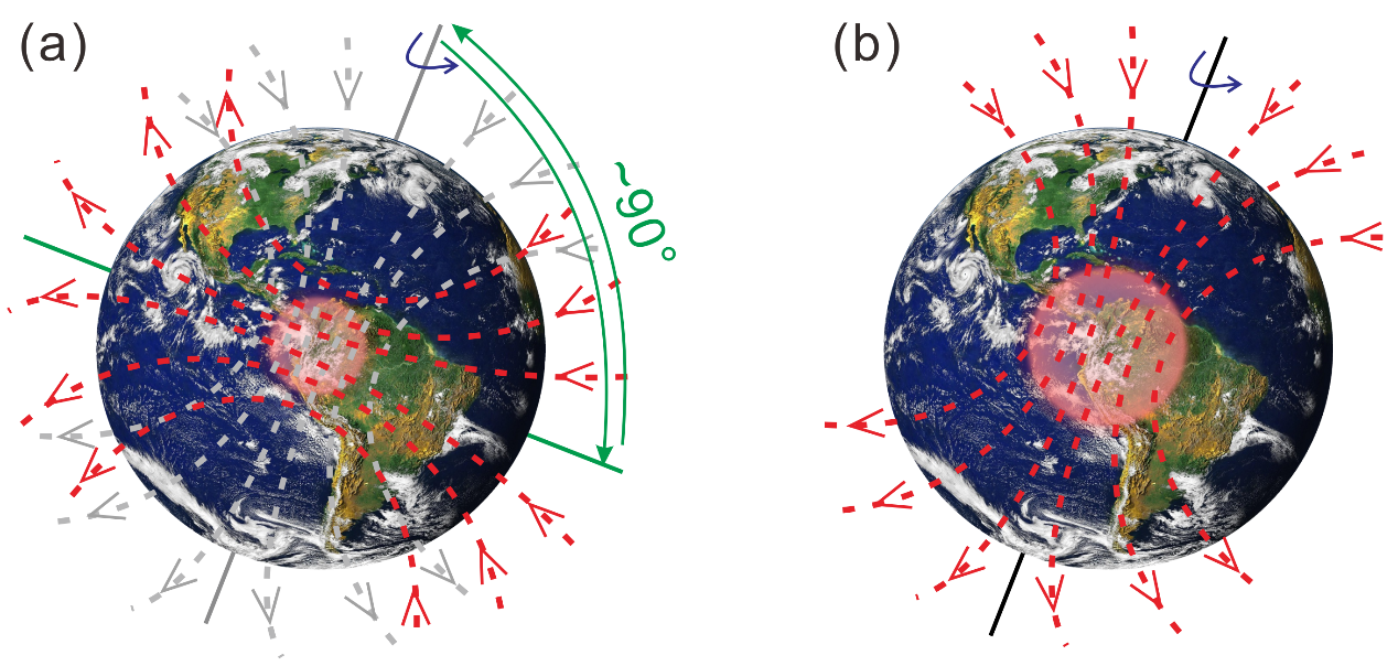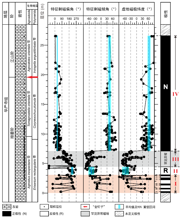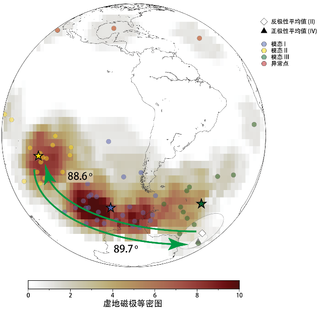 针对上述问题,科研人员对浙江江山碓边寒武纪“金钉子”剖面开展了详细的古地磁研究,获得了晚寒武世大约4.95亿年前的地磁极性变化记录(图1)。结果表明,这一时期的地磁场变化表现为:极性高频倒转期(I),短暂的反极性期(II),罕见的异常期(III)和极性稳定期(IV)。对罕见异常期(III)的古地磁结果进一步分析发现,磁极发生了快速摆动,幅度可达~90°(图2),持续时间为~8万年。这说明,磁极偏离了地球自转轴,为非地心轴向偶极子场 (non-GAD), 且偏离幅度巨大,达到接近赤道的极端状态。这样的磁极摆动特征与地球惯量主轴互换导致的真极移(Inertial Interchange True Polar Wander, IITPW)特征非常相似。真极移是由地球质量分布变化引起的整个地球固体外圈层相对于其内部发生旋转的行为,即地球自转轴发生了改变。由于地幔粘度很大,大幅度的真极移不可能发生得很快。因此,该研究新发现的持续时间仅为~8万年而幅度接近极限~90°的磁极摆动反映的应该是地磁场的极端异常行为,而不是真极移。