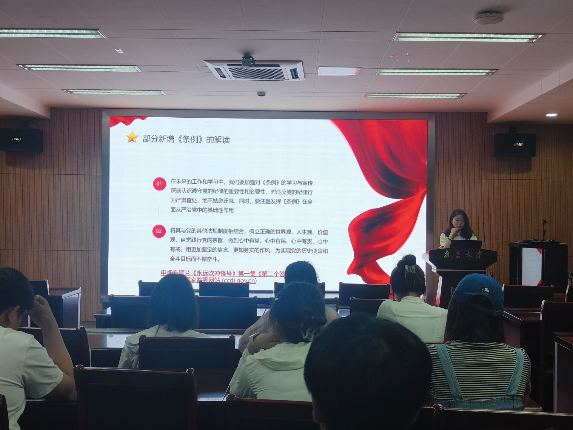 304永利集团官网入口2023级硕士生二支部于6月27日在朱共山楼125举办了以《中国共产党纪律处分条例》为主题的专题党课,通过深入解读条例内容,强化党员纪律意识,推动全面从严治党向纵深发展。党课由党支部书记陈婷婷同志主持。