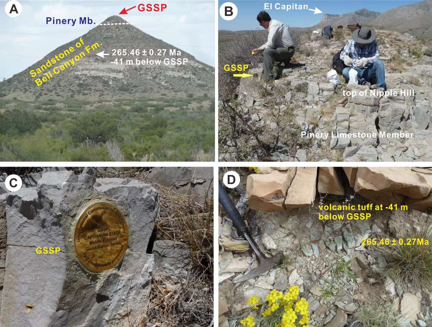 图1 美国瓜达鲁普山国家地质公园Nipple Hill剖面卡匹敦阶底界“金钉子”野外露头照片