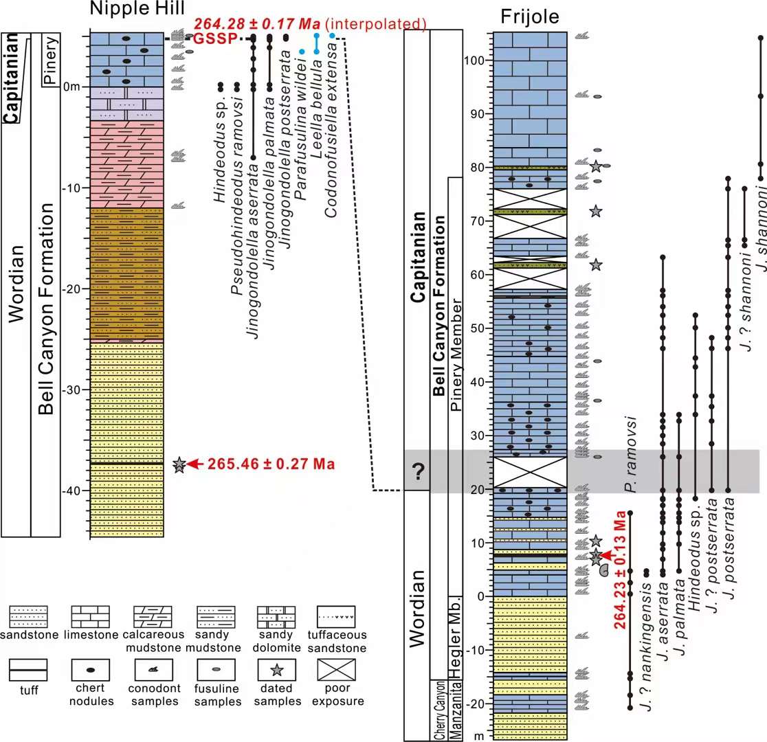 卡匹敦阶“金钉子”位于美国瓜达鲁普山地区Nipple Hill剖面,该剖面卡匹敦阶底界之上仅出露0.5 m地层,难以进行详细的长尺度生物地层学等的研究。为了解决这一难于克服的自然条件问题,研究团队在距离该剖面以西约2.9 km找到了新的含有这一界线的Frijole剖面,该剖面连续出露了从沃德阶中部至卡匹敦阶上部的地层,研究团队对该辅助层型剖面也进行了深入细致的研究。系统的CA-ID-TIMS高精度锆石U-Pb年代学研究卡定卡匹敦阶底界年龄被为264.28 ± 0.16 Ma,磁性地层学对比结果表明伊拉瓦拉反转(Illawarra Reversal) 位于卡匹敦阶底界稍下方层位,锶同位素化学地层学研究显示87Sr/ 86Sr比值在整个卡匹敦阶持续下降。无机碳同位素结果显示在沃德阶-卡匹敦阶之交没有明显的碳同位素漂移;综合对比表明,卡匹敦阶相当于特提斯地区以䗴类生物地层为基础建立的Midian阶的中上部。