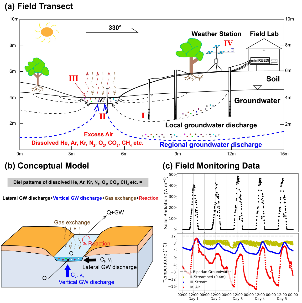 相关成果于2023年8月以“Quantifying Carbon Cycling across the Groundwater–Stream–Atmosphere Continuum Using High-Resolution Time Series of Multiple Dissolved Gases”为题发表于《Environmental Science & Technology》。论文第一作者为博士生研究生汪钏,通讯作者为谢月清教授,合作者包括瑞士联邦水科学技术研究院Matthias S. Brennwald博士、Rolf Kipfer教授、西澳大学James L. McCallum教授、304永利集团官网入口博士研究生戴鑫和吴吉春教授。此研究得到了国家自然科学基金、关键地球物质循环前沿科学中心、中央高校基本科研基金、304永利集团官网入口登峰人才计划B层次、江苏特聘教授项目和瑞士碳中和及碳封存DemoUpStorage项目的联合资助和支持。