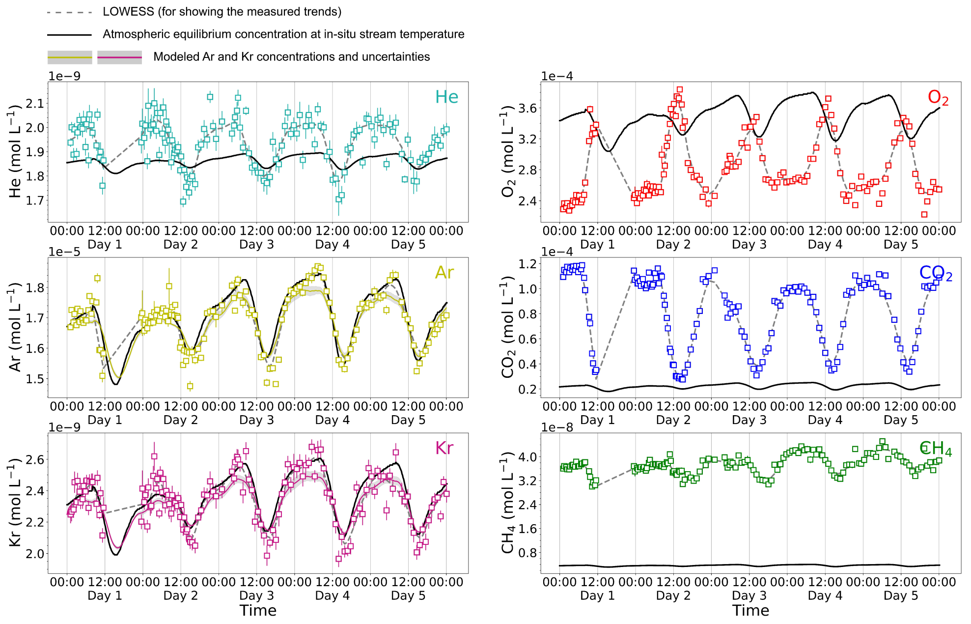 高精度的监测结果表明,河流中天然溶解的多种气体均呈现出显著的昼夜变化,且不同气体的变化规律和驱动因子各不相同(见图2)。在此基础上,本团队创新性地提出了利用水体中天然溶解的气体信号解译碳循环的新思路。其中,惰性气体He、Ar和Kr因其生物和化学惰性,只受到物理交换和混合的影响。因此,可以用来确定河流-地下水界面以及河流-大气界面的气体交换速率。在物理交换过程确定的基础上,高精度的反应性气体O2、CO2和CH4数据可以用来联合解译河流内部碳的生物代谢、碳酸盐缓冲和产CH4等过程。