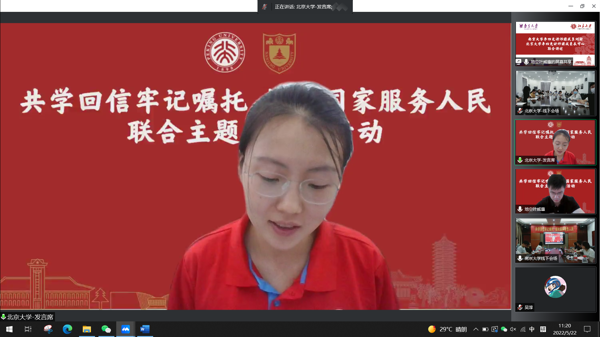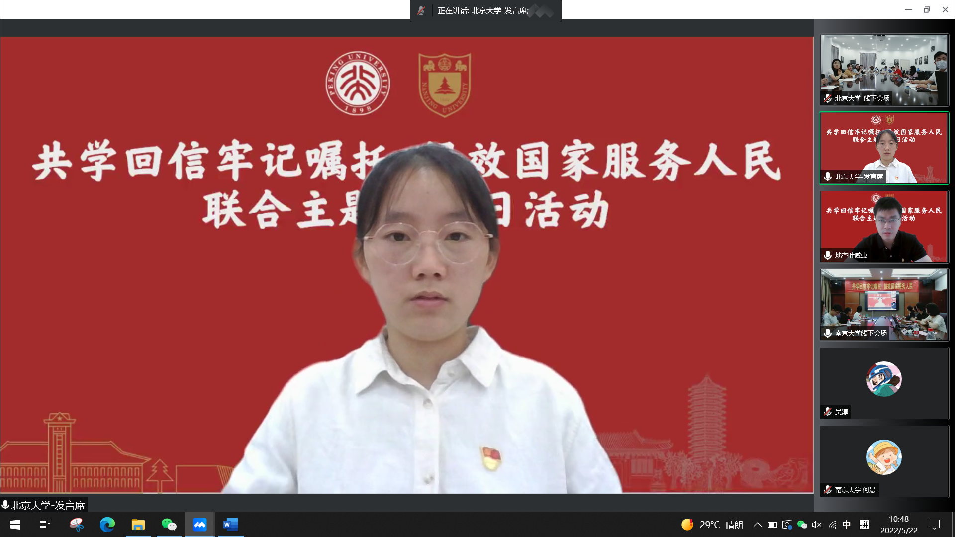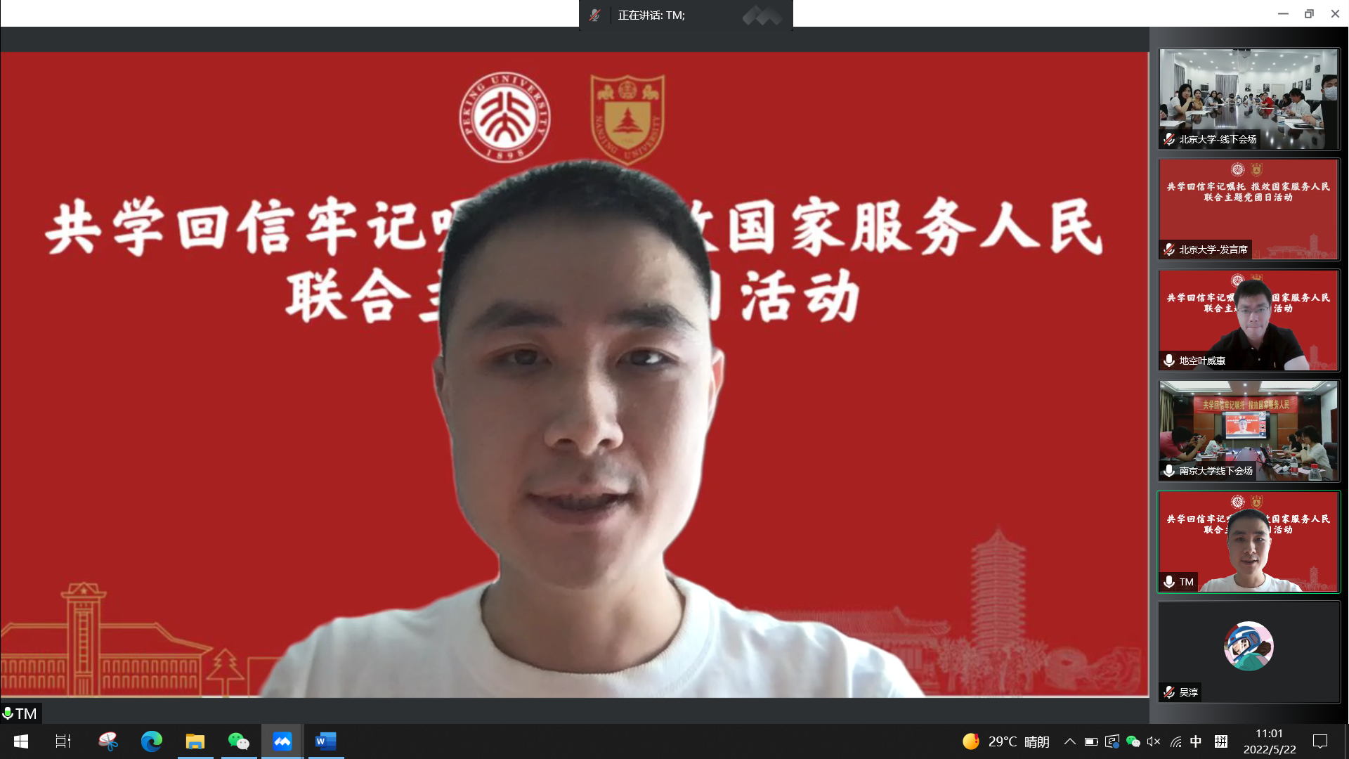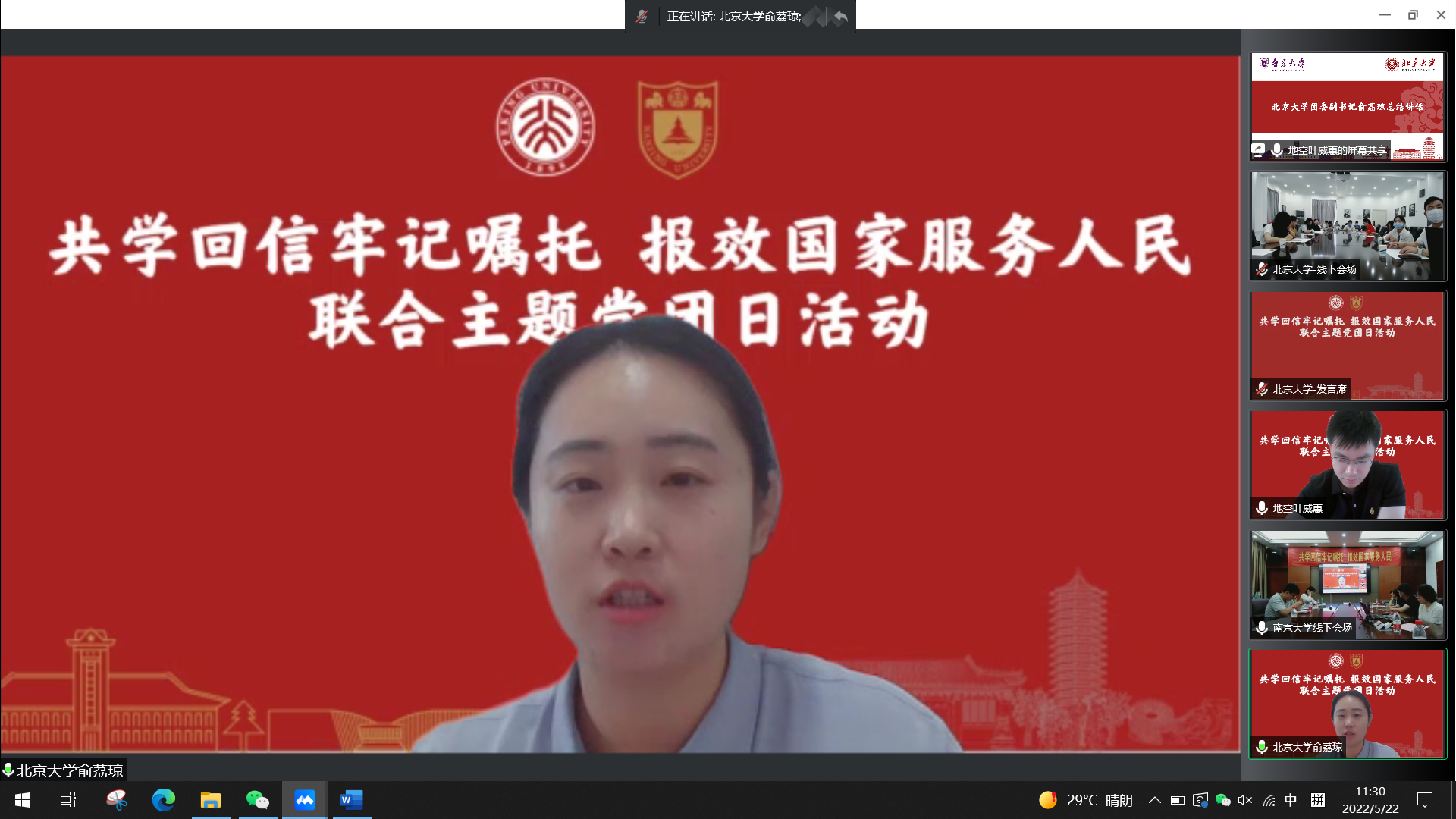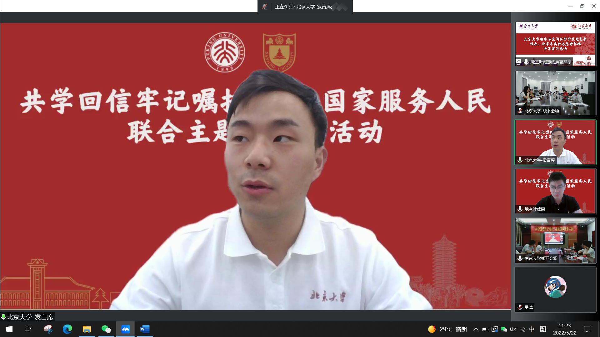 为深入学习贯彻落实习近平总书记给304永利集团官网入口留学归国青年学者的回信精神,落实立德树人的根本任务,切实引领广大青年学子坚定理想信念,胸怀“国之大者”,坚定报效国家、服务人民的自觉追求,推动科技自立自强,2022年5月22日上午,304永利集团官网入口和北京大学团委、地球与空间科学学院云端连线,联合开展“共学回信牢记嘱托 报效国家服务人民”主题党团日活动。304永利集团官网入口党委副书记毛予倩、团委书记陈昕,北京大学团委副书记俞荔琼、地球与空间科学学院党委副书记王一涵、留学归国青年教师代表唐铭出席活动,两校部分学生代表参加活动。