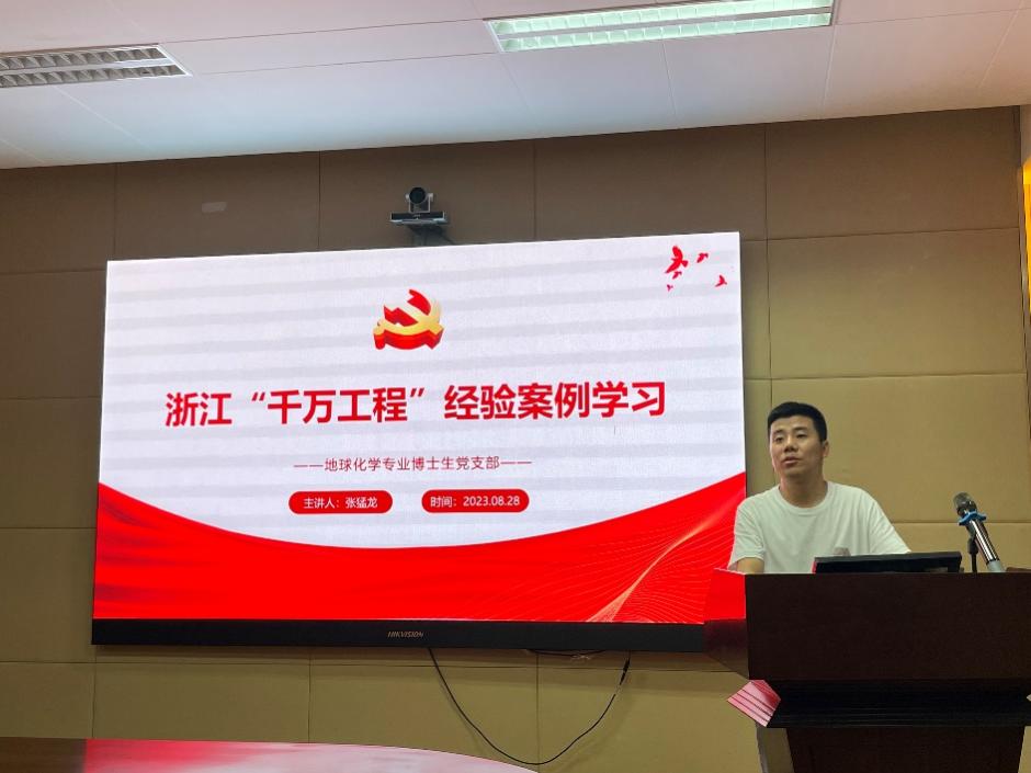 2023年8月28日中午,304永利集团官网入口地化专业博士生支部在朱共山楼A205会议室召开主题党日活动,活动主题为学习习近平总书记在文化传承发展座谈会上的重要讲话精神和浙江“千万工程”的经验案例。活动由支部书记张猛龙同学主持。