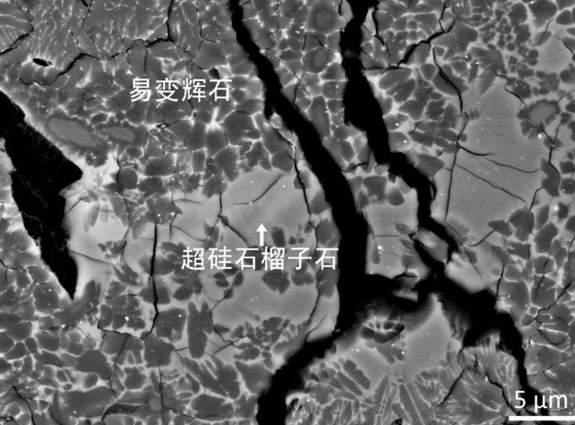 图3. NWA 8326中充填于易变辉石晶间的超硅石榴子石背散射电子像