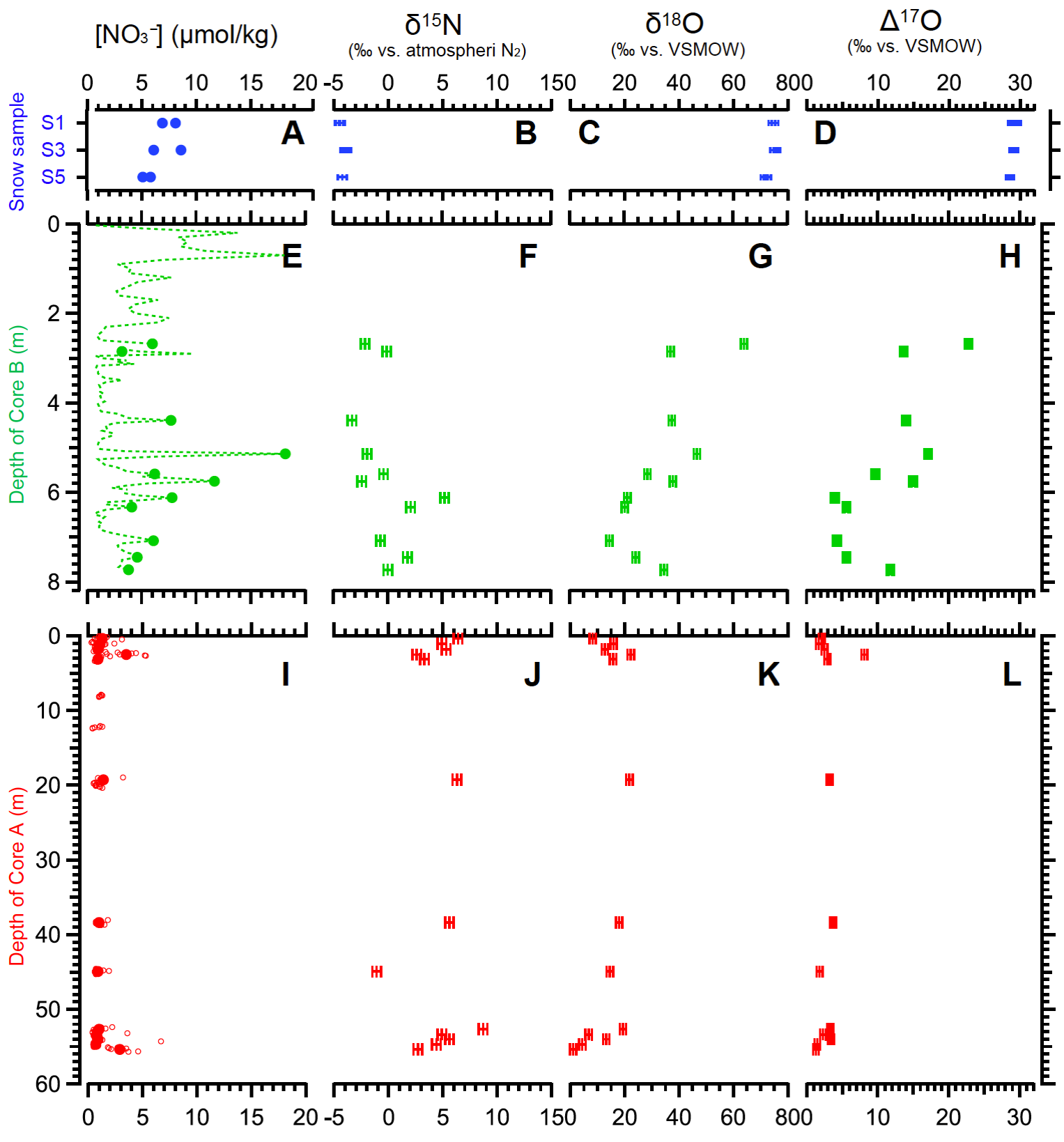 服部教授及其团队使用冰川的硝酸根(NO3-)的三氧同位素组成(Δ17O)来详细地调查冰川内部的生物活动。大气中生成的硝酸根从大气中的臭氧(O3)中获取氧原子,其Δ17O值继承了臭氧的信号,相对较高(大约+25‰以上);而由微生物活动产生的硝酸根,即硝化作用,其Δ17O值为0‰。利用这一差异,通过检测冰芯或冰川中硝酸根的Δ17O值,可以确定其中硝酸根的来源,即是直接来自大气沉降还是后期由生物活动产生的。在本研究中,他们比较了天山山脉乌鲁木齐1号冰川的新雪(大气沉积后1年内的),积雪区的雪芯(firn core,沉积后10年内的)和消融区的56m冰芯(沉积后几百年)的NO3-含量及其δ15N、δ18O、Δ17O值(图1)。
