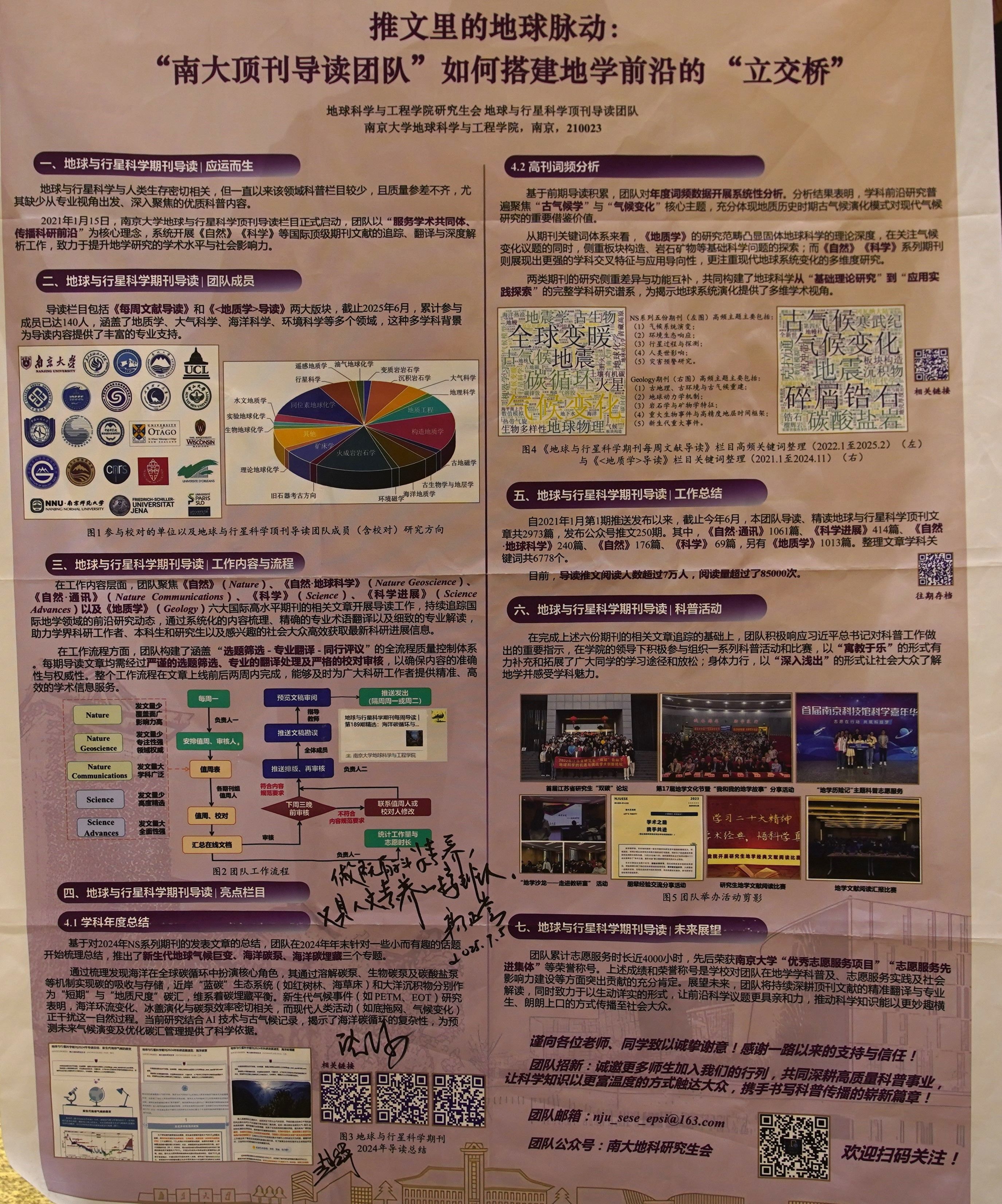 7月5日上午,在大会的科普工作圆桌论坛讨论环节,地科院董婷书记与地科院2024届毕业生、中国科学院南京地质古生物研究所博士后申博恒博士分别发言。董婷书记从招生、培养和就业三个方面,结合304永利集团官网入口地科院做法经验,分享了对地球科学教育双高衔接的理解。申博恒博士作为团队主要发起人之一,向各位参会代表介绍了团队工作的内容和流程,表示来团队未来可以通过转型调整,尝试面向中小学普及地球科学研究前沿动态。中国科学院院士、中国科学院古脊椎动物与古人类研究所周忠和研究员建议团队未来可以针对国内学术期刊进一步开展科学传播工作。中国科学院院士、国家自然基金委员会地球科学部郭正堂主任,北京大学沈冰教授,中国科学院广州地球化学研究所赵太平研究员等与会专家为团队展板题字,勉励团队在科学传播工作上再接再厉。