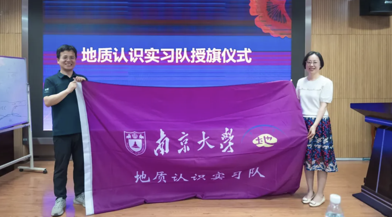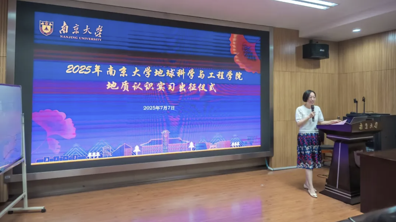 学院董婷书记在出征仪式上致辞。她指出,地质认识实习作为地质学类本科生培养体系中的关键环节,学院一直以来的高度重视,2023年开拓南京-云南地质认识实习新基地,在教学团队、实习基地、实习经费等方面了给予全方位的支持。董婷强调,本次实习作为地质学类本科生首次接触的野外实践课程,是衔接“普通地质学”“固体地球科学原理”等基础理论课程的重要纽带,更为将来的专业理论课程和早期科研训练提供了重要支撑,是将理论知识与实践探索紧密结合的重要机遇。全体师生在野外要牢固树立安全意识,严格遵守实习纪律,教师们要以高度负责的态度保护好自己和学生的人身安全,确保实践教学活动安全有序开展。仪式最后,董婷向实习队队长胡修棉教授授予队旗,标志着2025年度地质认识实习正式启程。