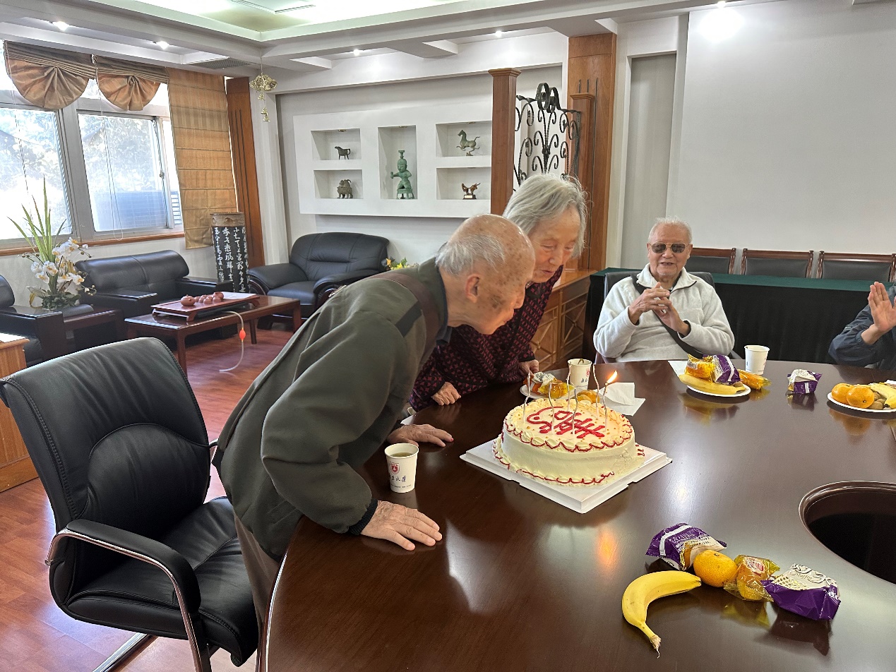 接下来,董婷书记代表地科院全体师生的心意,为寿星们举行祝寿仪式。伴随“生日快乐”的主题曲,献上深情祝福,献上带有“寿”字的大蛋糕,二位年纪90岁的寿星代表吹灭蜡烛,气氛热烈,老同志深受感动。