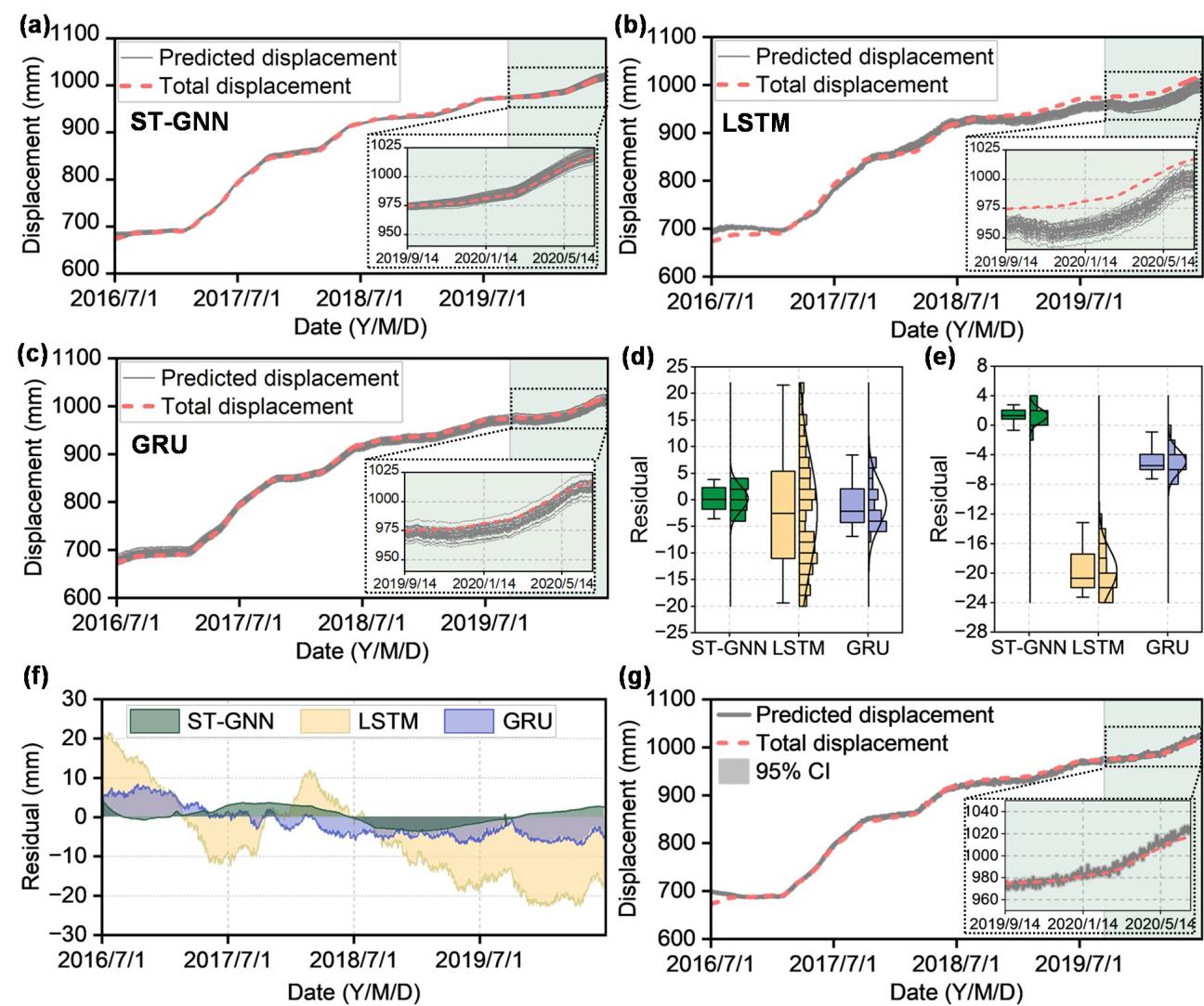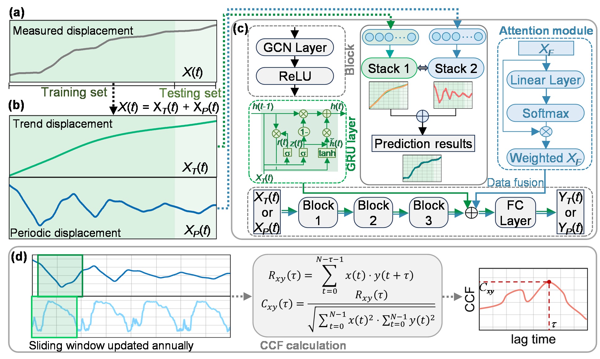 针对上述关键科学难题,304永利集团官网入口朱鸿鹄教授课题组提出了一种融合图神经网络(GNN)与门控循环单元(GRU)的可解释性时空深度学习模型(ST-GNN,如图1所示),为滑坡预测预警开辟了一条新路径。ST-GNN模型通过GNN构建滑坡多个测点的空间拓扑关系,依据欧氏距离与位移序列的皮尔逊相关系数定义邻接矩阵权重,实现跨点位特征共享;同时采用GRU捕捉环境驱动因子的动态时序规律,并内嵌特征级注意力机制,自动识别关键驱动因子并量化其影响权重,形成时空双维度的耦合分析框架(图1)。研究团队引入了物理机制驱动的数据预处理流程:首先分离滑坡位移的趋势项(反映长期演化)与周期项(反映季节性波动),进而通过互相关函数校正库水位变动、降雨等影响因子对滑坡位移演化的时滞效应,显著提升了该模型对滑坡动力过程的刻画精度(图1d)。