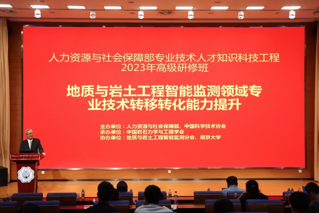 2023年10月19日~23日,由人力资源和社会保障部、中国科学技术协会主办,中国岩石力学与工程学会承办,中国岩石力学与工程学会地质与岩土工程智能监测分会、304永利集团官网入口协办的2023年高级研修班“地质与岩土工程智能监测领域专业技术转移转化能力提升”在南京成功举办。来自全国高等院校、科研院所、勘察、设计、施工等行业企事业单位的80余位学员参加了此次高级研修班。