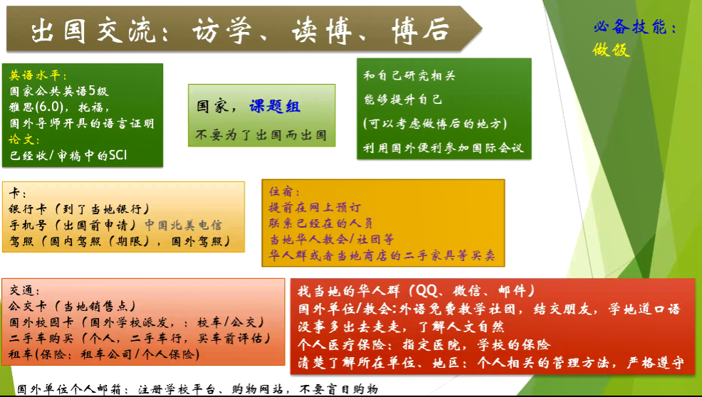 随后,宗美荣学姐分享了关于出国留学的相关经验,包括学习经验和生活经验。学姐特别强调了不要为了出国而出国,否则浪费的是自己的时间。在申请出国留学时要充分考虑自己想去的国家,特别是要考虑自己申请的课题组所做的研究是否和自己相关,去那里之后能否提升自己。一个好用的判别方法就是问自己是否愿意去那里做博后,如果愿意那这样的课题组就是值得去的。对于出国所需要的事前准备如外语,论文等学姐都一一做了详细的介绍,同时也分享了一些在国外生活的经验。